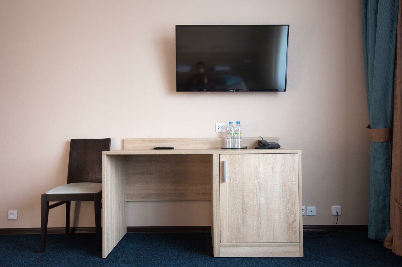 В номере: Смарт тв, телефон, фен, холодильник, душ, туалет, тапочки, новые обои и ковролин, 2 раздельные кровати. Окна номеров выходят как на центральный проспект города, так и на тихую дворовую территорию. Площадь номера составляет 18 м2.