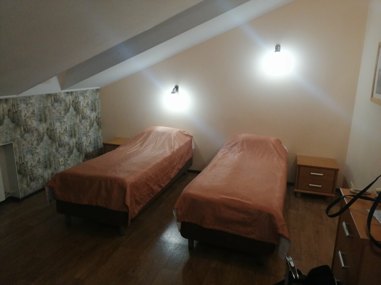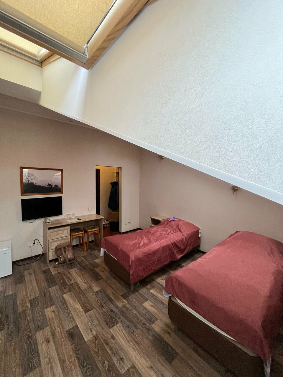 Площадь номера 18 кв.м на мансардном этаже гостиницы «Lagom»Уютный номер для отдыха со всеми удобствами.В номере имеются 2 односпальные кровати (при желании кровати можно сдвинуть или раздвинуть), прикроватные тумбы, телевизор, бесплатный WI-FI.