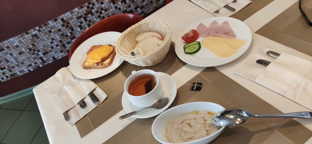 Неплохая бюджетная гостиница. Завтрак без выбора, но очень вкусный. Разваренная овсянная каша, гренка с сыром и яишница. Всё очень вкусно. На ресепшн можно встретить спящего толстого котика.