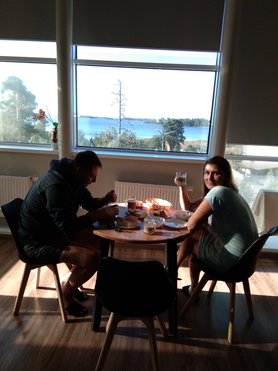 Хорошее место. Были в номере Финляндия, всё чистенько и приятно. Кровати великолепные, бельё чистое, аж хрустит. Всё необходимое в номере есть. Холодильник есть. Вид на озеро. Персонал приветливый. Сауна большая, комната отдыха с огромным телевизором. Есть чай, сушки,мед. Всё предоставляют, халаты,полотенца. Бассейн хороший, чистый. Завтрак приличный,каша,омлет, сосиска,круасан,чай, кофе, батон,масло сыр. Нашлись прямо у камина. Впечатления максимально положительные. От города центр 6 минут на авто. Удобно и тихо. Единственный маленький минус слабый вай фай, а сеть плохо работает, интернет. Но по сравнению со всем,это мелочи.