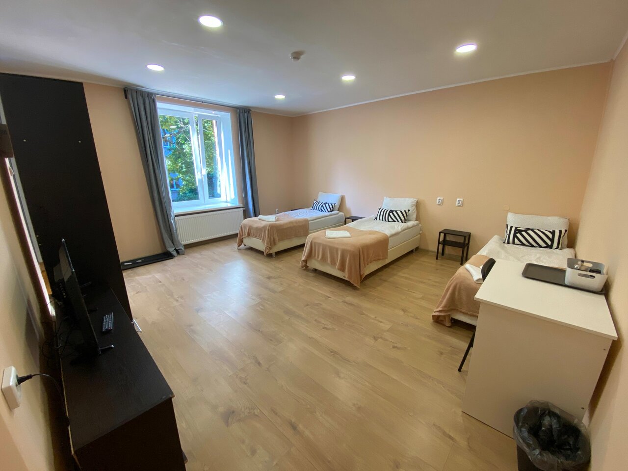 Комната для троих. Было тихо, посторонних шумов не было (попались тихие соседи). Отдохнули после прогулки по городу, выспались. Плиты нет, только микроволновка, чайник. Не хватает стола (нет места чтобы выпить чай/кофе и поесть доширок :)). Нет душевого поддона, трап в полу туалета. Яркаую надпись ‘выход’ над входной дверью закрыли платной бумагой, а то мешала бы спать.