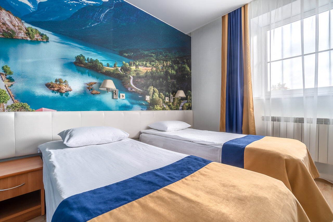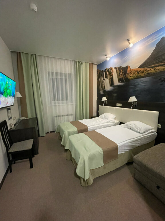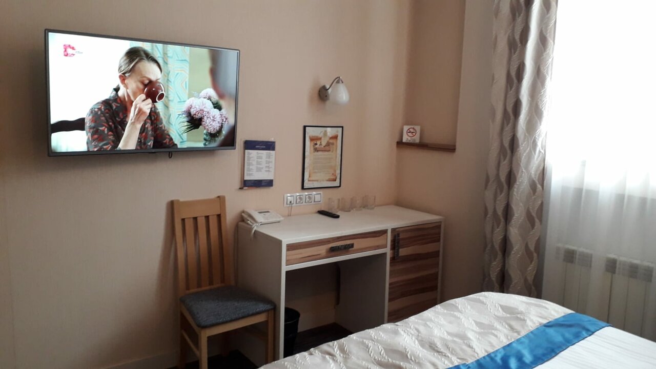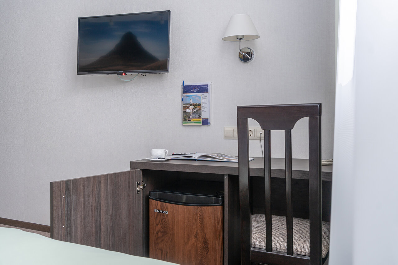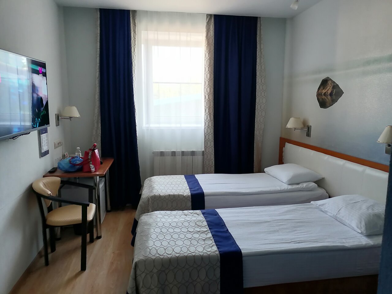 Хорошая гостиница с чистыми отремонтированными номерами и правильным постельным бельём. В номере есть очень небольшой холодильник, телевизор, фен в ванной комнате. Чайника в номере нет, но есть кулер с горячей и холодной водой. Завтрак в кафе — шведский стол. Большой ассортимент еды и напитков. Вкусно