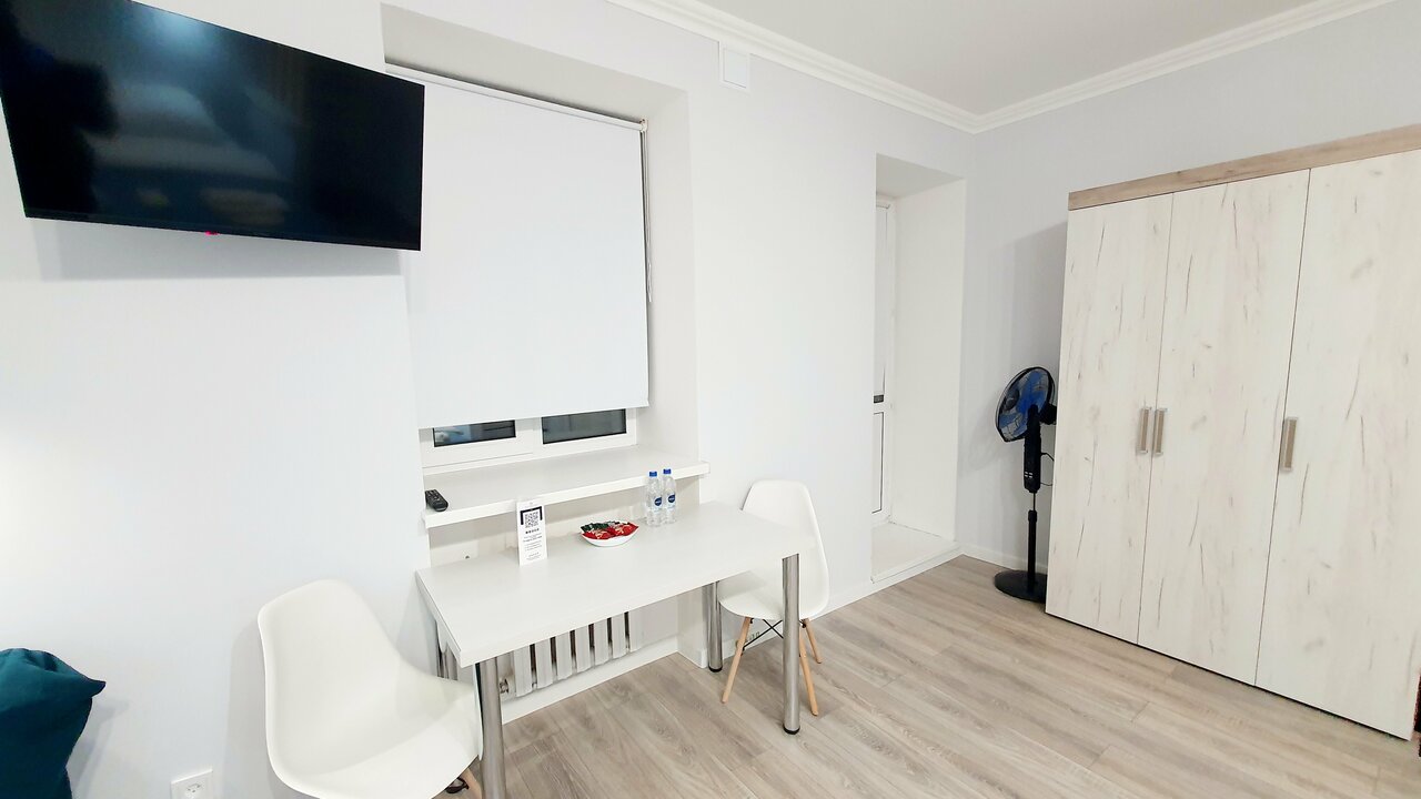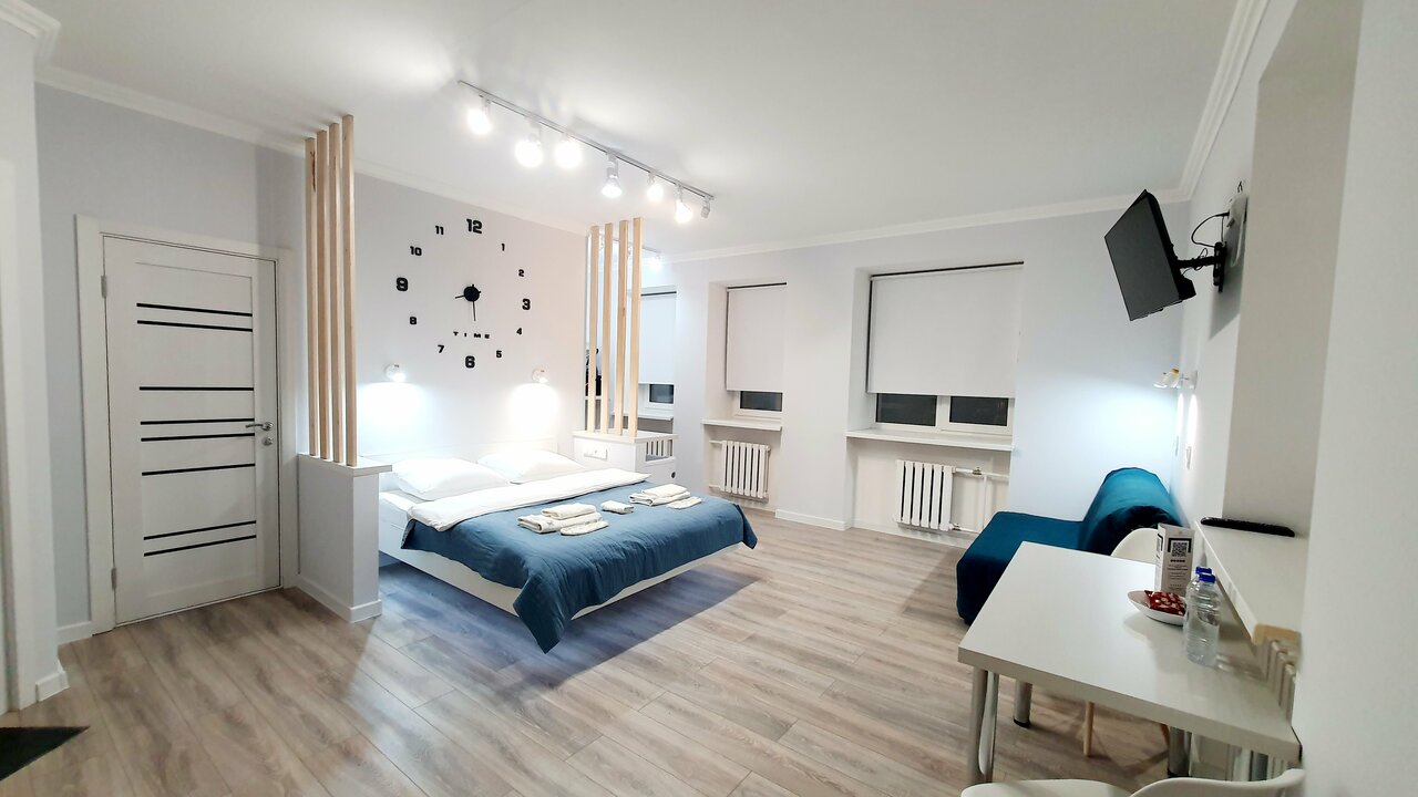 Отличная студия!!!! Чистая, светлая, все необходимое для отдыха имеется.В номере 2-х спальная кровать и диван, плита, микроволновка, телевизор, холодильник, чайник.Как презент чокопай)) за что отдельное спасибо от детей. В номере есть мини-бар(отдельно оплачивается) Классно что все бесконтактно.Так же утром можно будет выпить кофе на ресепшене.