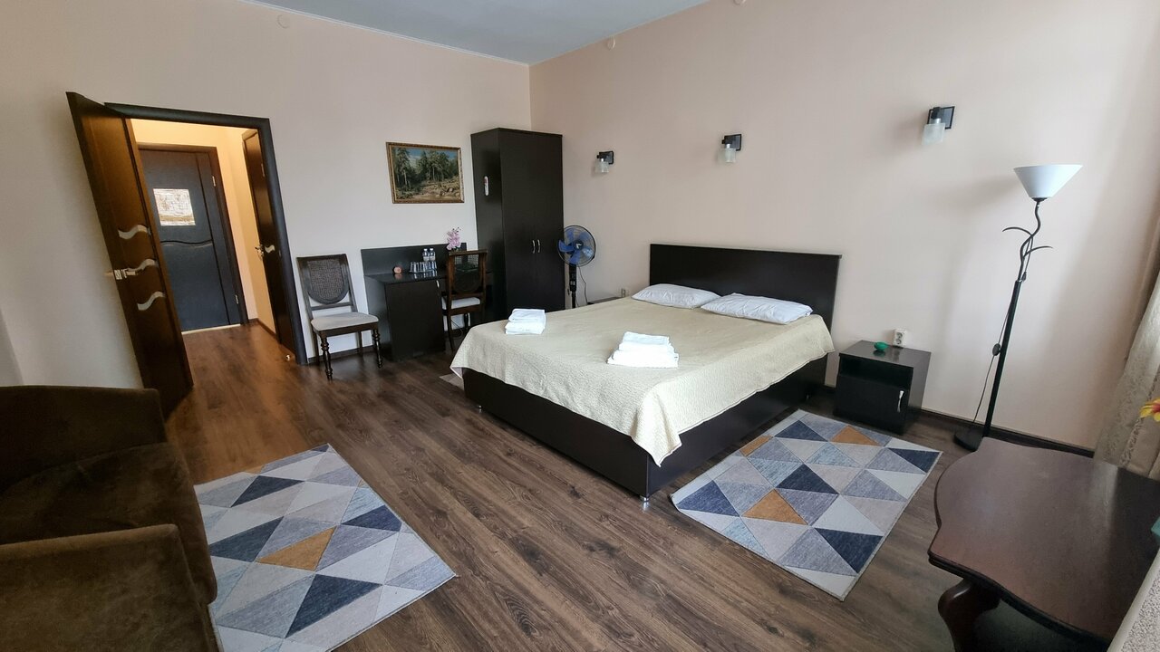 Размещение в номере категории Люкс (до 4 мест). Оснащены: одной широкой двухспальной кроватью + одной компактной полутораспальной кроватью, вместительным шкафом для хранения одежды. Максимальная вместимость – 4 человека. Заезд – 14:00 / Выезд – 12:00