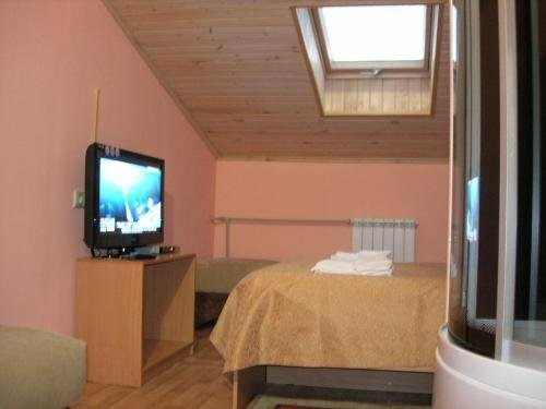 Номер на мансардном этаже с двуспальной кроватью и диваном, оборудован всем необходимым для отдыха.