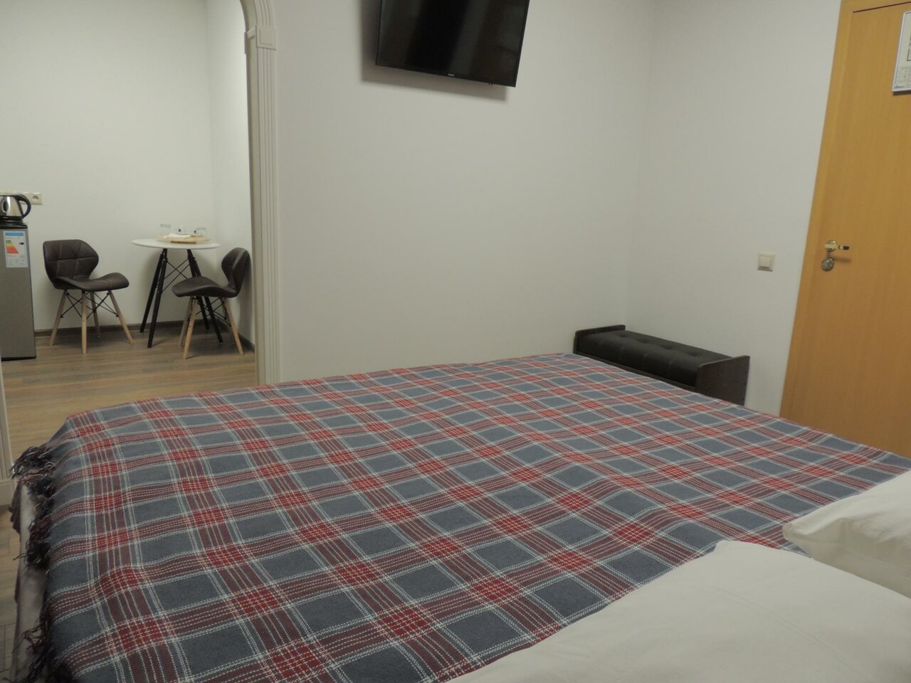 В номере располагается двуспальная кровать, шкаф, мини холодильник, кресло.