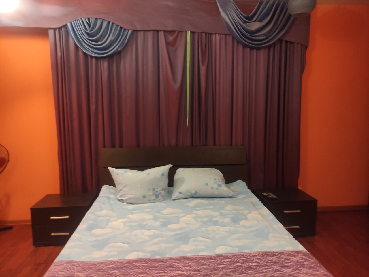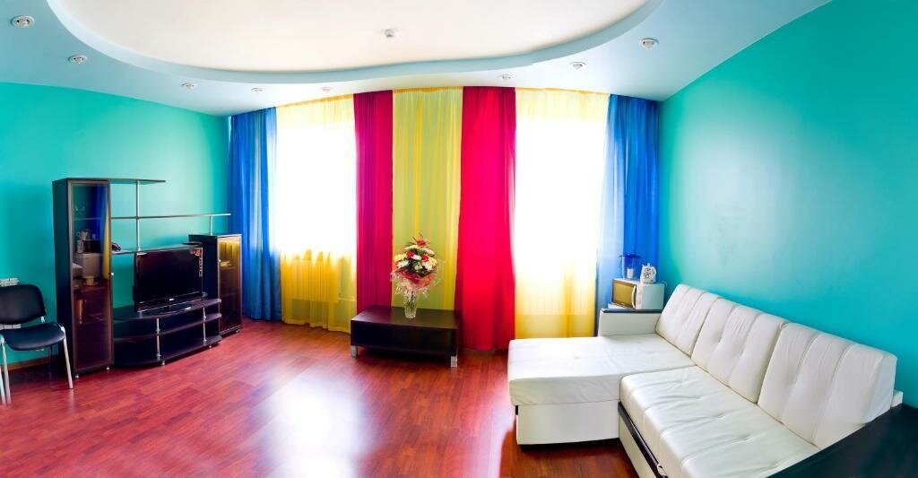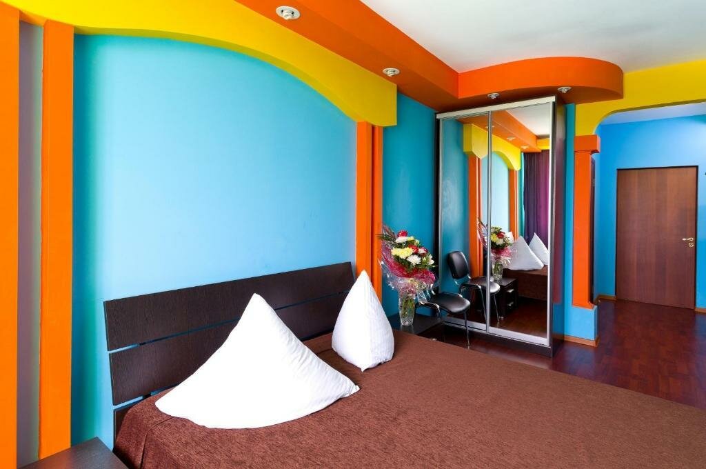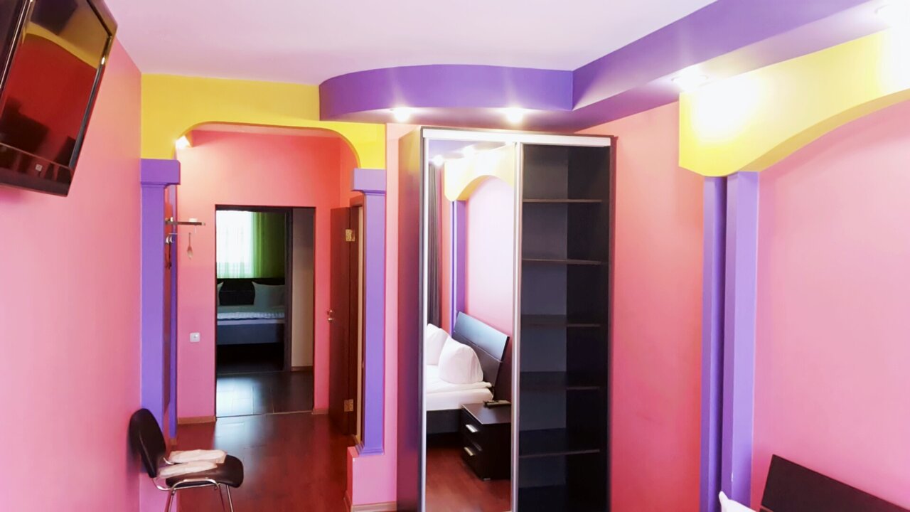 Очень отзывчивый персонал, любые просьбы выполнялись, видно было, что нам рады. В коридоре шкаф с посудой, сахар, чай, микроволновая печь, в номере чайник. Кулера с водой не было, но на первом этаже круглосуточный Дикси, всё для удобства туристов. Что касается самих номеров, у нас их было два, то несмотря на ядовитый фиолетово-жёлтый интерьер, было очень уютно, тепло, кровати удобные. Сняла одну звезду за пыль: полки, полы, подоконник покрыты толстым слоем. Ребёнок пробежал по полу без тапок – носки в стирку (