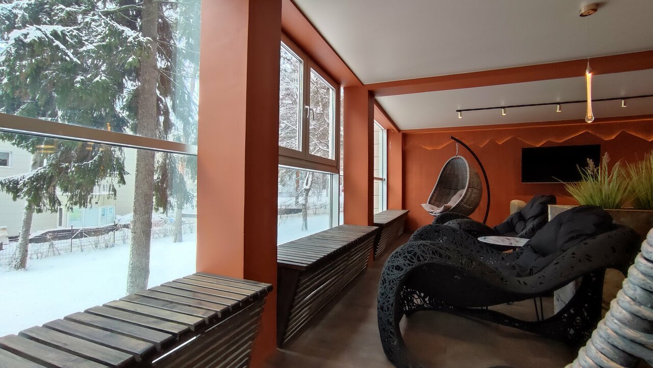 - Наличие сауны в номере.; Нормальный выбор еды.; Хороший номер (но холодный).; Размеренный и душевный отдых.; Кинотеатр с интересными фильмами.