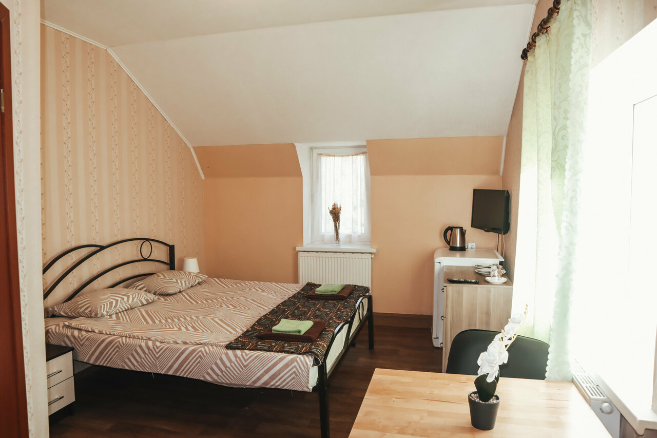 Двуспальный номер, санузел с душевой кабиной, телевизор, тумбочки, обеденный стол и стулья. В стоимость включено все для Вашего комфорта: банные принадлежности, набор полотенец, фен для сушки волос! На всей территории парк-отеля работает WI-FI