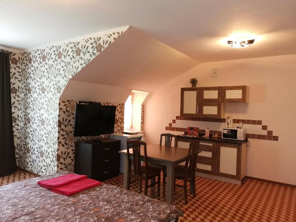 Двуспальная кровать, холодильник, санузел с душевой кабиной, телевизор, тумбочки, обеденный стол и стулья. В стоимость включено все для Вашего комфорта: банные принадлежности, набор полотенец, фен для сушки волос!