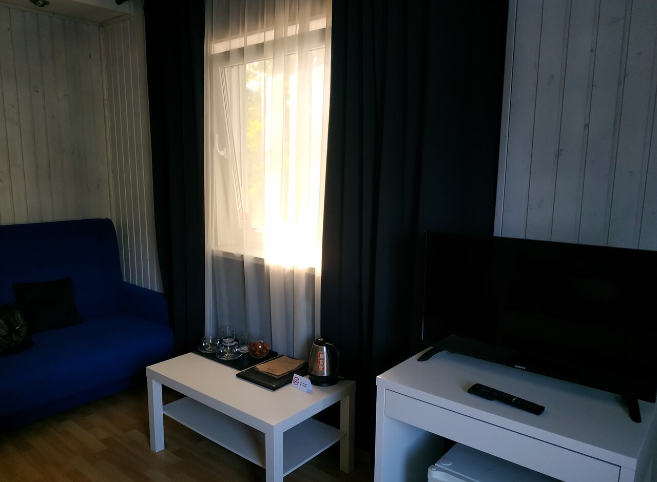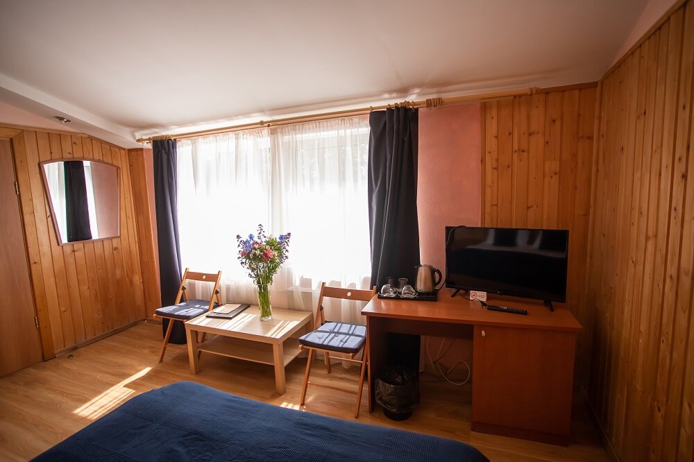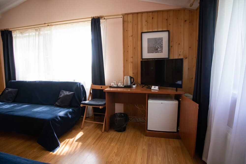 Номер со своим санузлом в комнате. Дополнительно ставится расскладушка. В номере кондиционер, мини-холодильник, телевизор, кондиционер, шкаф -пенал. Стоимость июнь 1800₽, июль и август 2000₽ за номер в сутки.