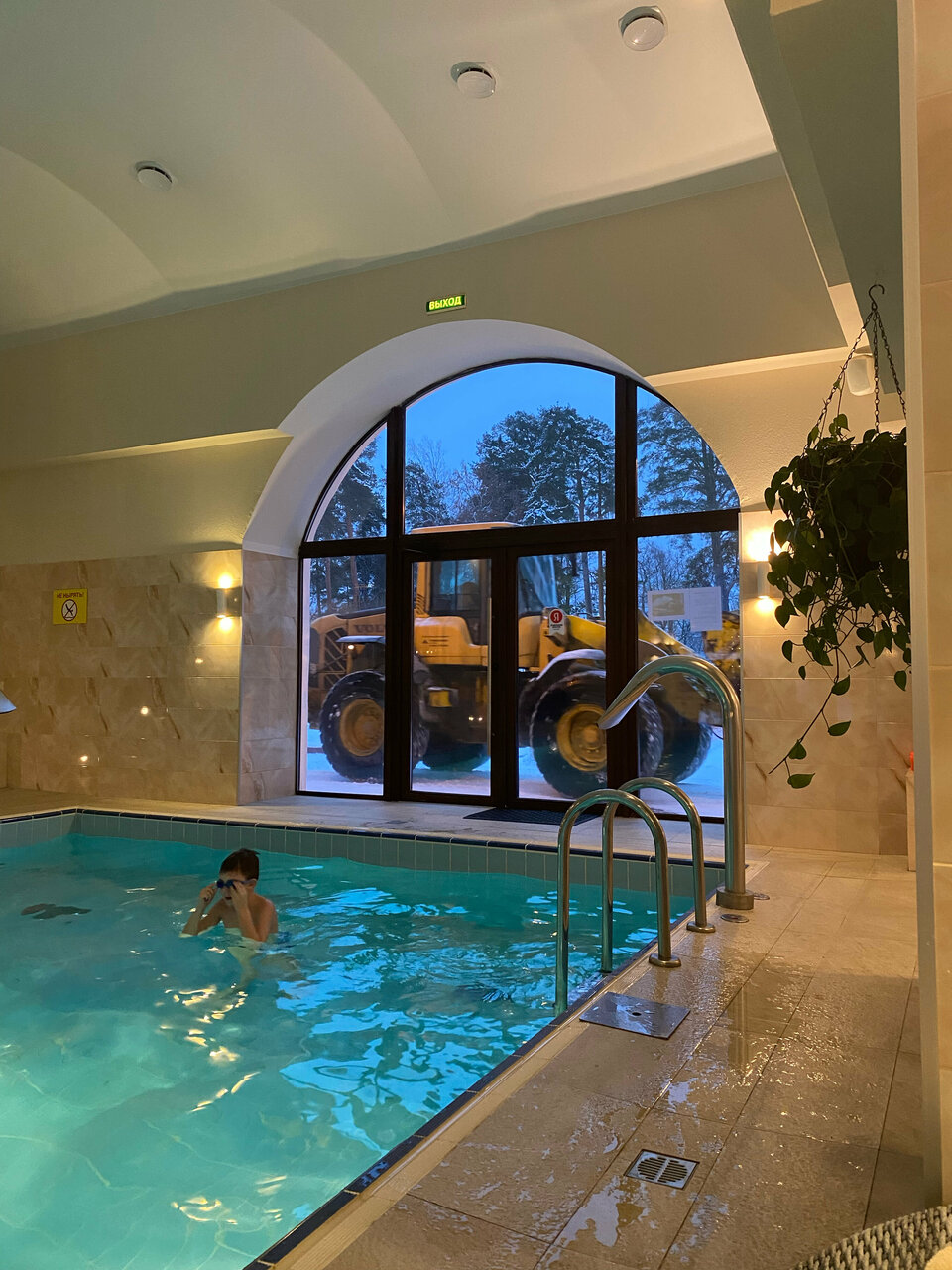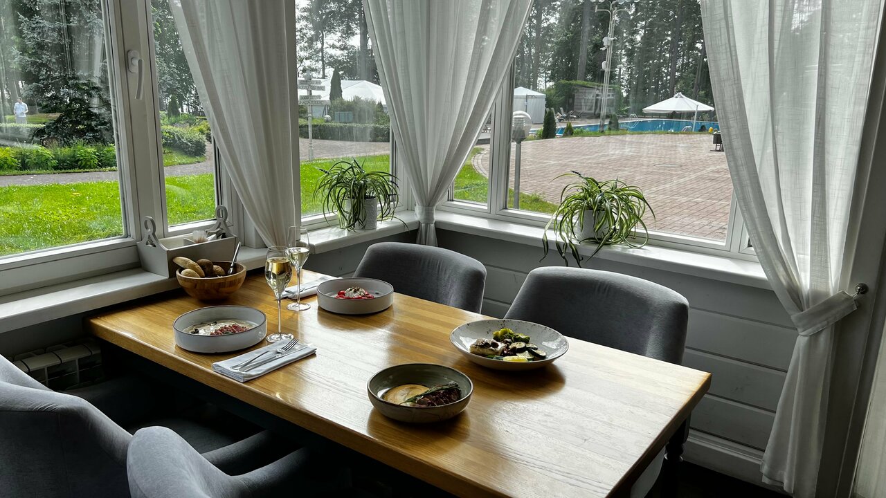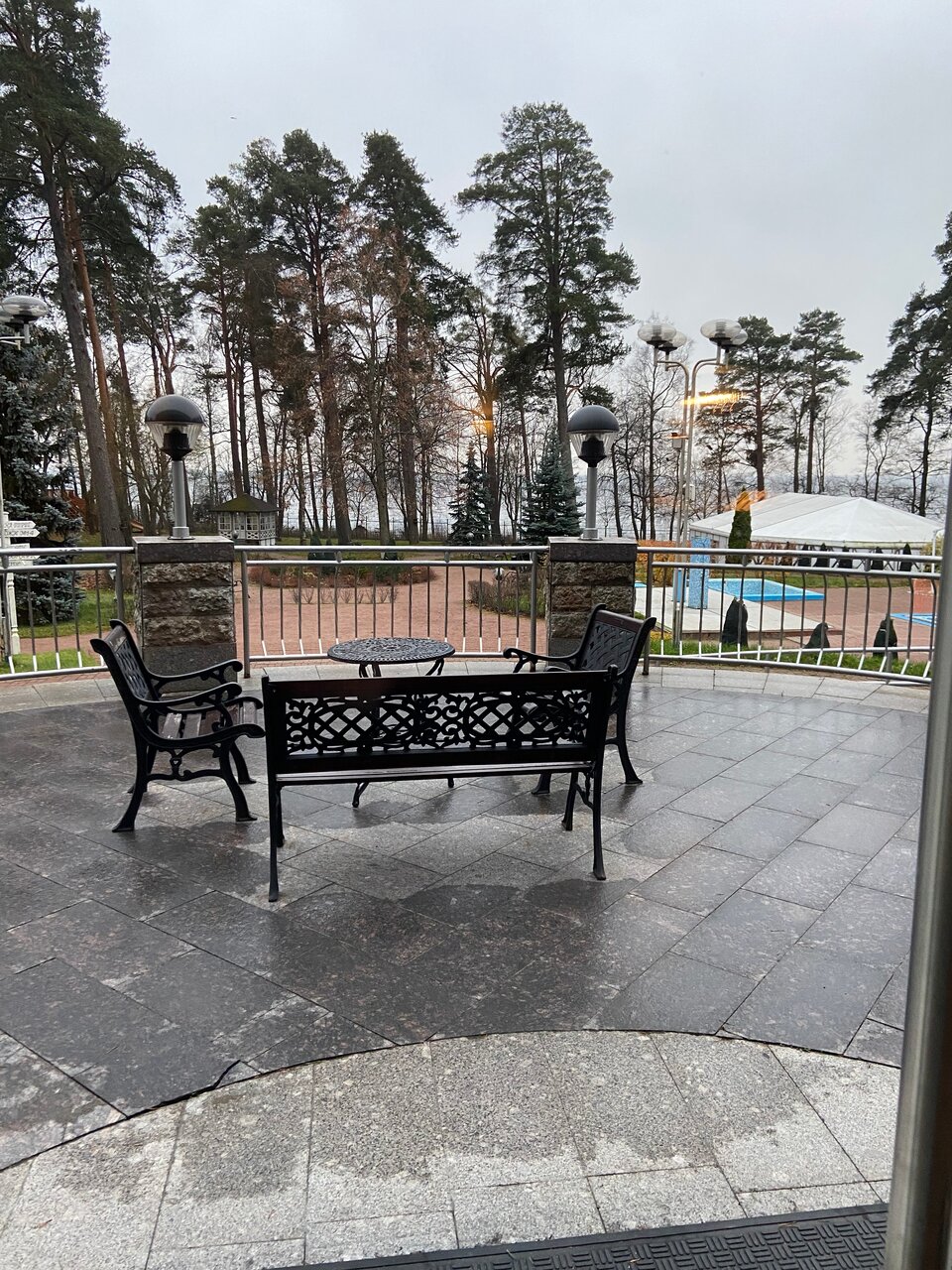 Территория рядом с Финским, ухоженная, уютная. Номера изрядно изношенные. Звукоизоляция ужасная. Матрас жутко неудобный, положенный на скрипящее основание — ощущения как на раскладушке. Половина номеров — вид на шоссе. Завтрак — в целом вкусный, но такого разнообразия было бы более чем достаточно в 3*, но не когда ты заявляешься 5*: нет сухофруктов, орехов, лимона к чаю, соусов (выносили разве что бутылку кетчупа по запросу), один суп, одна каша, не вкусный кофе, мало выпечки, салатов, подкладывают нестабильно, так что можно прийти чуть позже и не обнаружить чего-то. Спа-зона небольшая, хаммам и сауна уютные. Бассейн с очень прохладной водой. Шезлонгов мало, часть удобные, часть очень не удобные. Все нерегулируемые. В спа-услугах заявлено парение в бане, но после запроса нам сказали, что парильщиков в ближайшие дни у них нет. Из плюсов: залит небольшой каток с бесплатным прокатом коньков, горка с парой ватрушек.