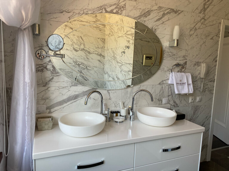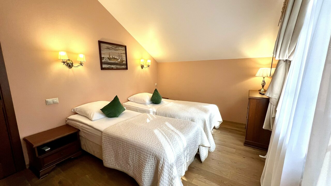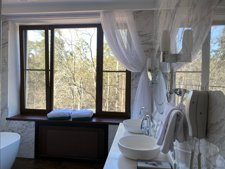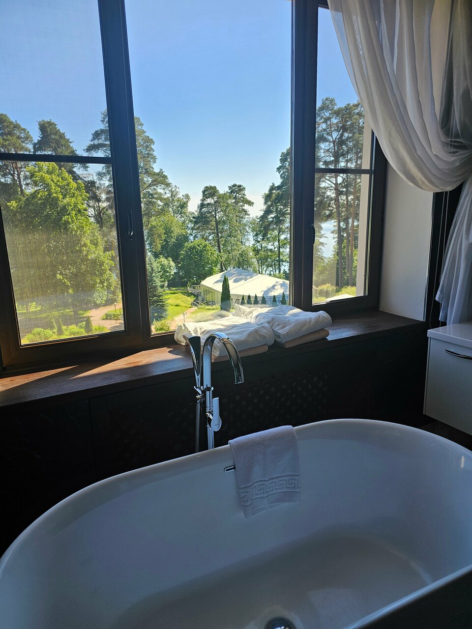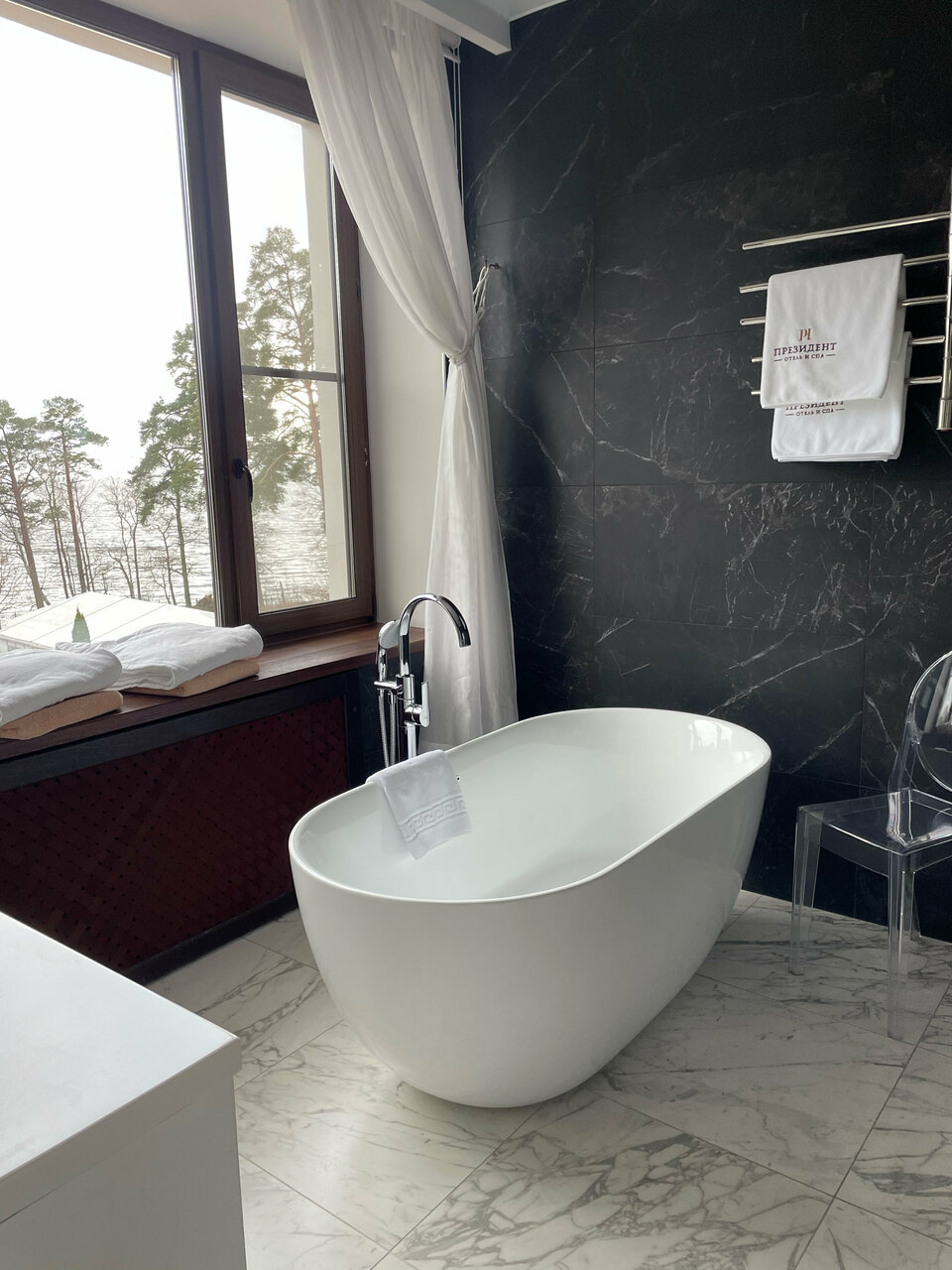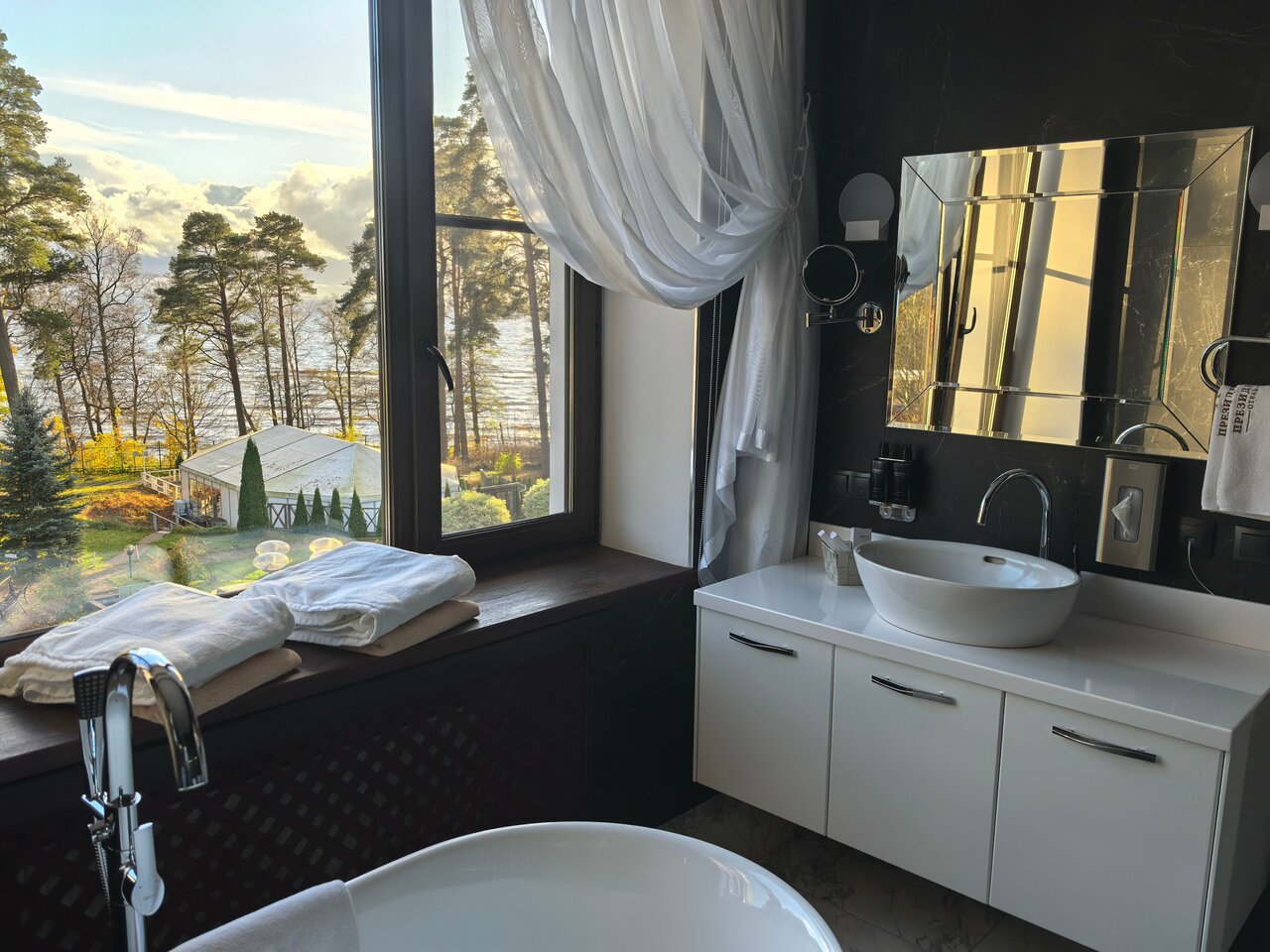 Были в номере делюкс Павловск, номер отличный, вид на залив, видовая ванная. Забронировали русскую парную или баню, точно не помню как называется. Вместо купели гидромассажная ванна, больше все это смахивает на сауну, в остальном место хорошее, приветливый персонал, хорошая локация на заливе