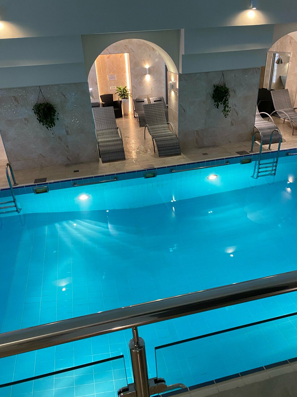 Отзыв пишу только на спа, сам отель не посещали. Отличное расположение, чистые бассейны, хорошие шезлонги. Ставлю 4 , так как считаю, что немного завышена цена, однако и большой плюс у цены есть — дети до 5 лет бесплатно! Необходимо записываться заранее (минимум за день), людей не набито. Ещё небольшой минус, в женской раздевалки один душ и один туалет, возможна небольшая очередь. Есть туалет так же на улице. Дают полотенце. Есть кулер с водой. Из ресторана можно заказать, прямо к бассейну. Все очень чисто!