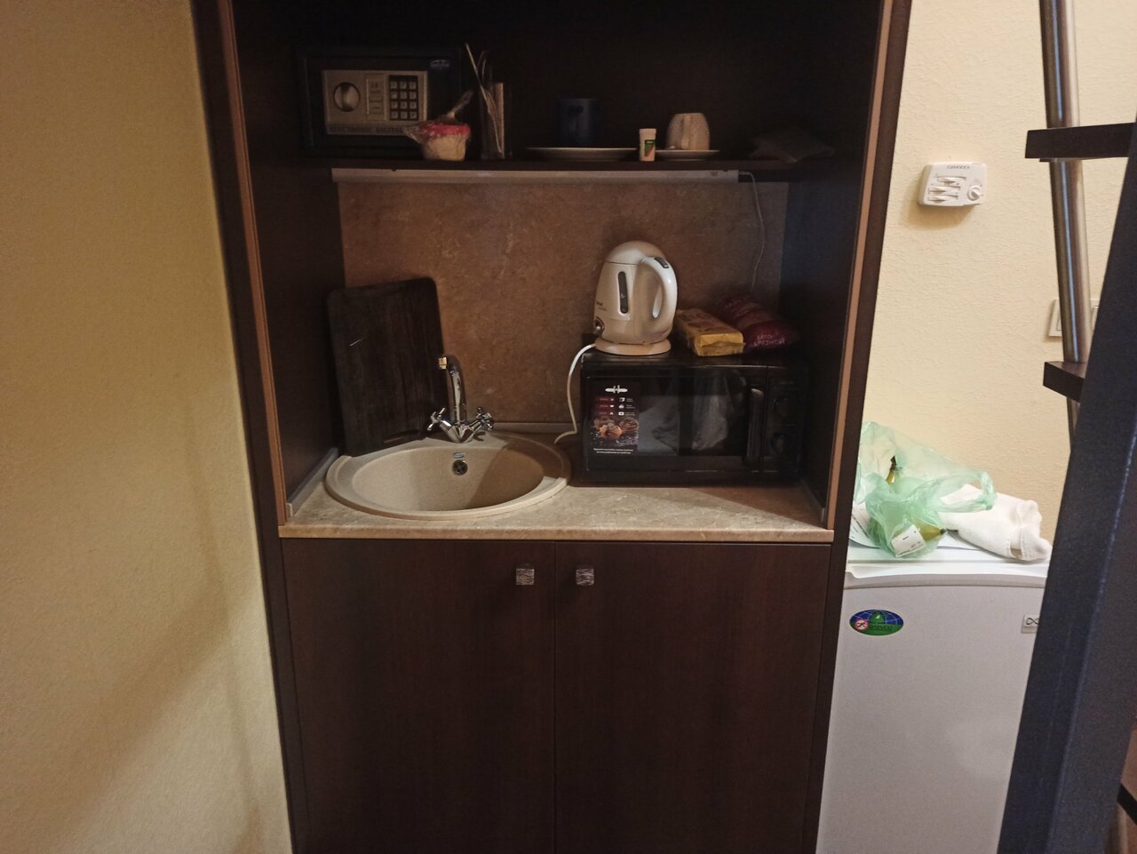 В номере нет ни чайника, ни холодильника. На этаже — кулера… ТВ настроить очень сложно. При проживании вдвоём ключ всё равно выдают один. Дорого.