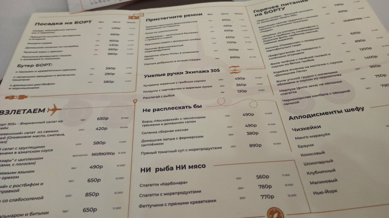 Были в ресторане. Людей было немного, обслуживание не люкс, но хорошее, приятное и не навязчивое. Интерьер светлый, свежий. Меню не маленькое — можно выбрать. Мы заказывали мидии крымские — мне понравились, муж заказывал жареху с курицей — тоже вкусно. Единственный минус это то, что выбранного нами десерта не оказалось и не было ничего другого из десертного меню а был не заявленный в меню десерт, официант его порекомендовал — но мне не понравился (простой) — поэтому 4 звезды! А в целом отличная идея! Желаю процветания и добавления побольше авиационных фишечек!!!