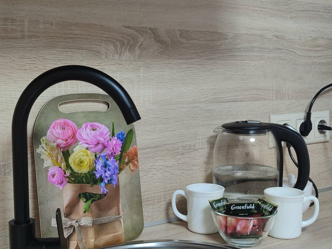 - Маленькая кухня с микроволновкой, чайником и холодильником.