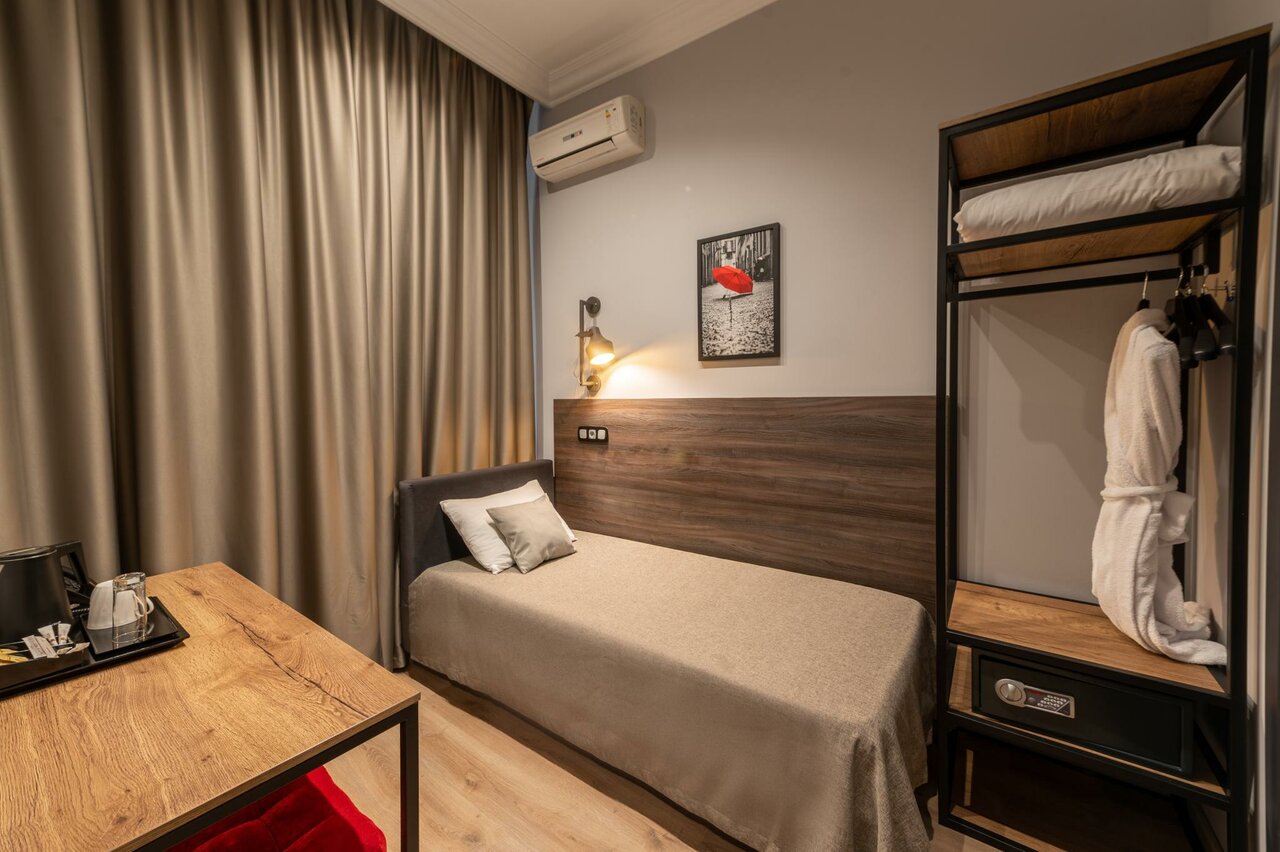 Удобства: — Кондиционер, холодильник, фен, телевизор, Wi-Fi — Санузел в номере, чай/кофе, халаты, тапочки — Звукоизоляция, сейф, чайник, уборка, прачечная — Круглосуточная стойка регистрации