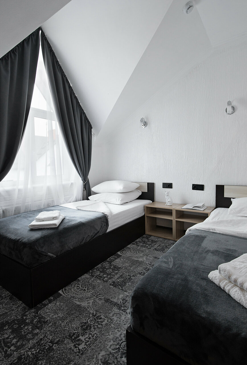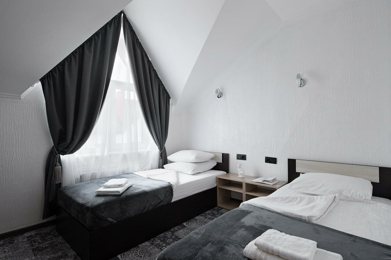 Двухкомнатный номер с двумя односпальными кроватями и диваном-кроватью.Указана минимальная цена за сутки, завтрак включен в стоимость проживанияАктуальную цену уточняйте по телефону