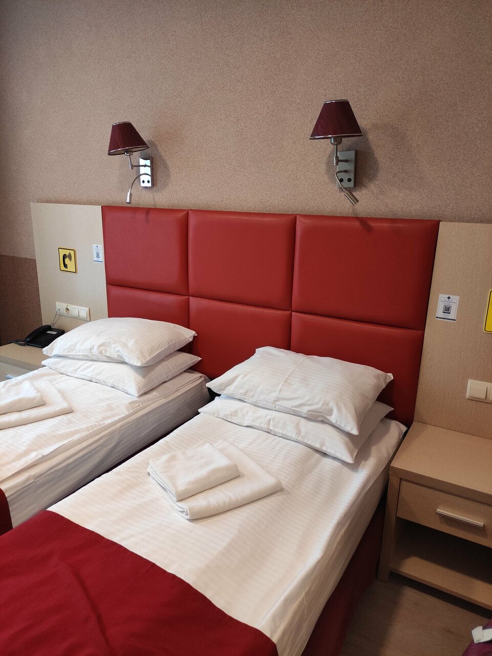 Останавливались в этом отеле семьёй. И, как оказалось, не ошиблись с выбором. Удобное расположение: 5 мин до вокзала, 2 мин до пешеходной туристической зоны. Внутри чисто убрано, в номерах есть все необходимое. Даже лифт есть! Из минусов: слышимость хорошая из соседних номеров и раковина очень маленькая — умываться неудобно. Но плюсов намного больше. Тем более, нагулявшись до позднего вечера, спишь как убитый и ничего не слышишь. Чего стоит хороший полноценный завтрак со шведским столом и круглосуточный кофе. Уборка номера каждый день. А также комплимент от отеля: яблочки и круассанчики при выезде. Поэтому небольшие недостатки не позволили мне поставить ниже твердой пятерки. Если поеду ещё раз, то обязательно рассмотрю данный отель для проживания. Да, кстати, забыл сказать, что это все достаточно недорого и конкурентно по цене с аналогичными предложениями.
