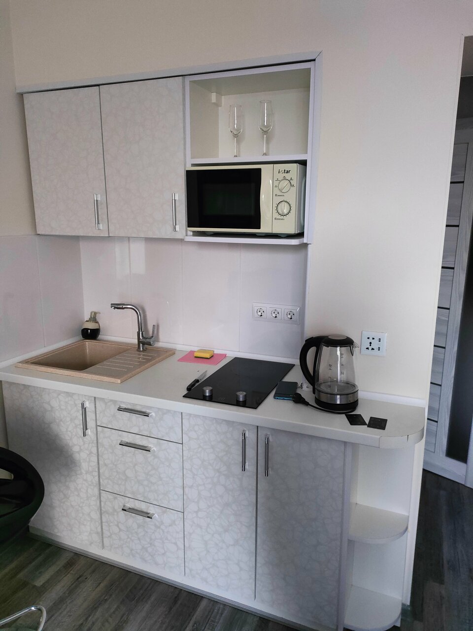 Чудесные апарты с видом на море! Обстановка немного уставшая, но нас это не смущало. Лифта нет, кому-то может быть критично. В номере на двоих каждого элемента посуды по 2 (кружки, тарелки, ложки, вилки). Так как мы были с ребёнком, было чуть неудобно. Можно забронировать ранний заезд/поздний выезд с небольшой доплатой (мы платили по 150 рублей за каждый час после расчётного). Это очень удобно! Расположение — лучше не придумаешь.