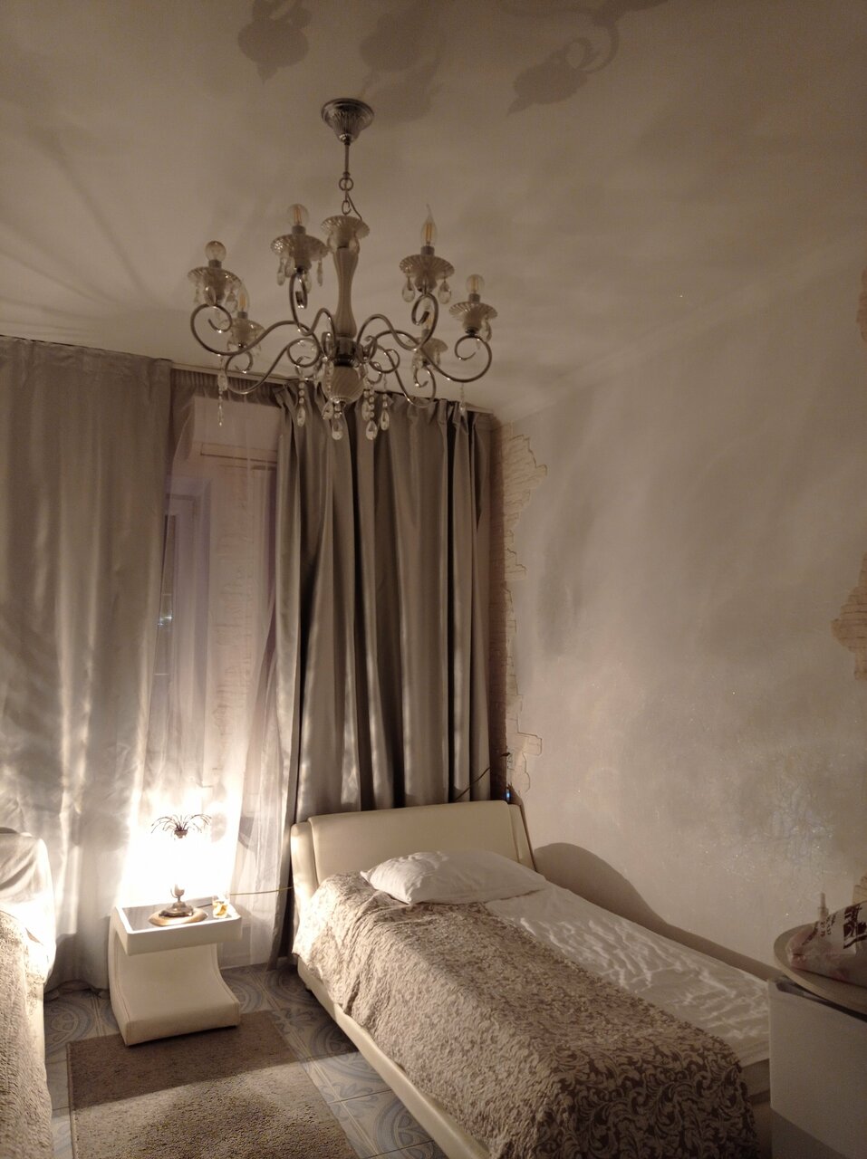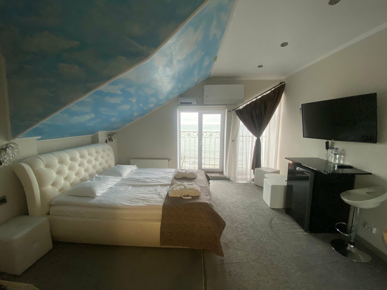 Расположение отличное, до моря 150 м. Номера сделаны с размахом, дизайнерски: крутые люстры, настольные лампы. Есть лепнина и украшения на потолке. Кондиционер.