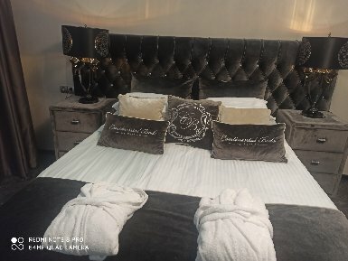 Видовой номер Люкс оснащен двуспальной кроватью King Size размером 2000 х 2000 с ортопедическим матрасом. Прикроватные тумбочки, диван, кухонный уголок с набором посуды, раковиной и микроволновкой, большой холодильник, обеденный стол и кухня.