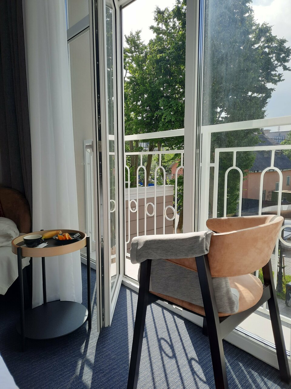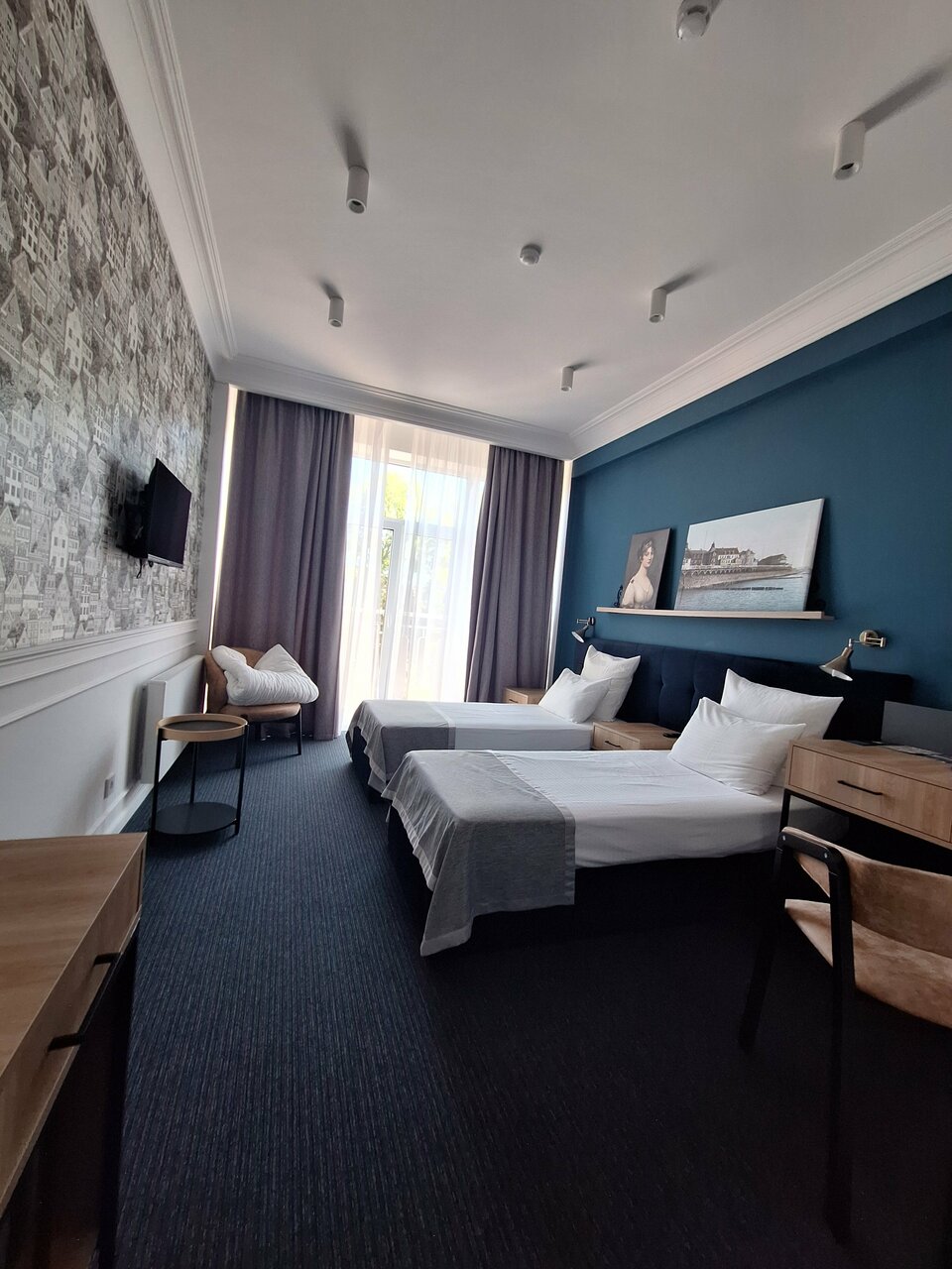 Внешне отель очень красивый. Расположение удачное. Рядом парк, до променада недалеко. Ремонт в номере идеальный. Все новенькое, стильное. Очень скучные для такого уровня отеля завтраки. Кашу приносят холодную и так мало, что не хватает даже ребенку. Блинчики холодные, хлеб только один вид и крошечные кусочки. Запеканка порезана на кусочки 11 см (зачем?) Соков нет, воду нужно ждать. В шкафу в номере нет штанги. Спа обещают запустить только к ноябрю. Есть парковка, что несомненный плюс в Зеленоградске