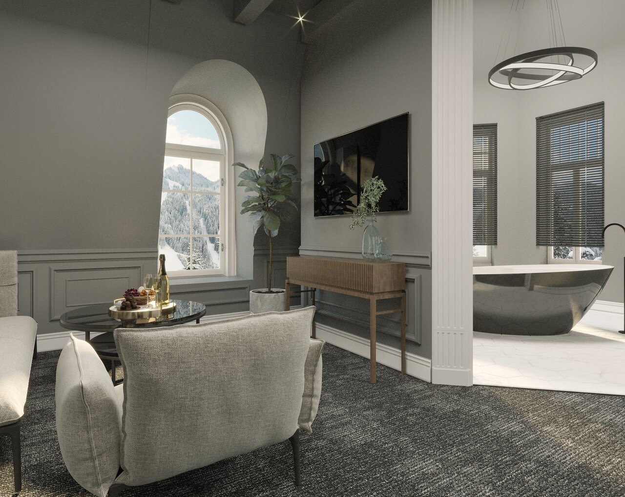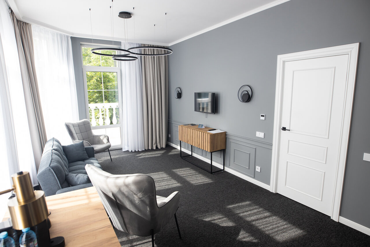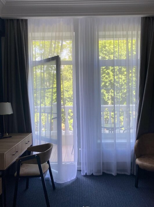 Двухкомнатный номер категории «Люкс» с балконом площадью 46 кв. метров с видом на парк. Номер данной категории расположен на 3 этаже.