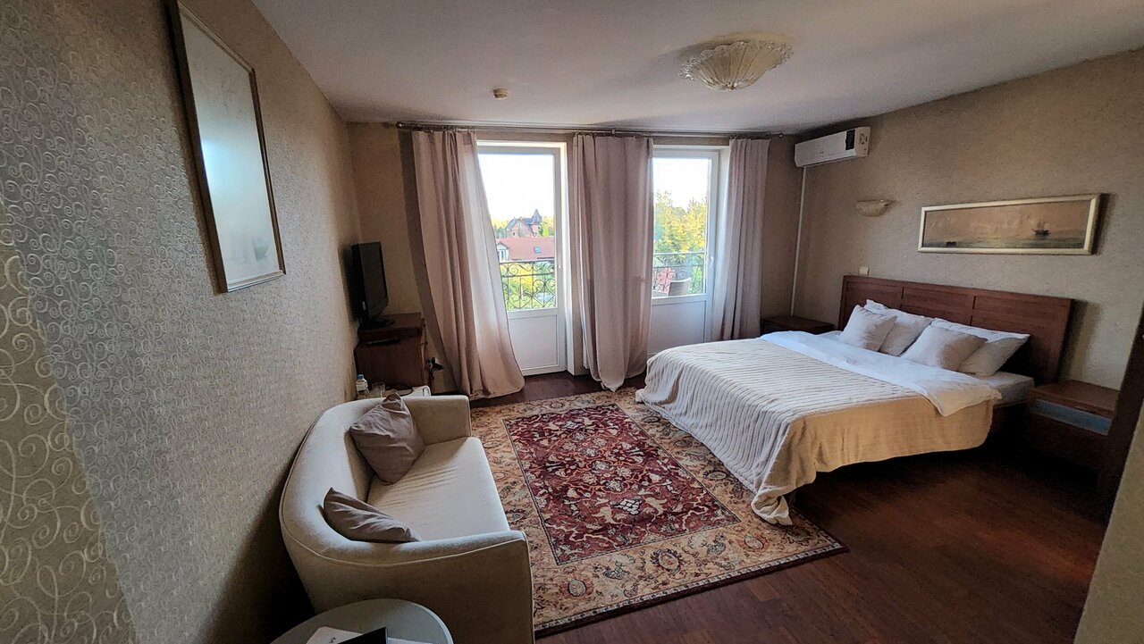 № 10. Комфорт 'Сербия-Белград'. В номере имеется: большая двуспальная кровать, прикроватные тумбочки и бра, телевизор ЖК, холодильник, электрический чайник, обеденная зона, сплит-система, собственная ванная комната (сан.узел. совмещён), фен, белые...