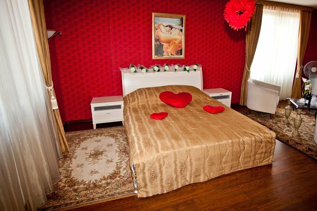 № 12. Полулюкс 'Франция-Париж'. В номере имеется: дизайнерский евроремонт, большая двуспальная кровать, прикроватные тумбочки и бра, телевизор ЖК, холодильник, электрический чайник, чайная станция, обеденная зона, сплит-система, собственная ванная...
