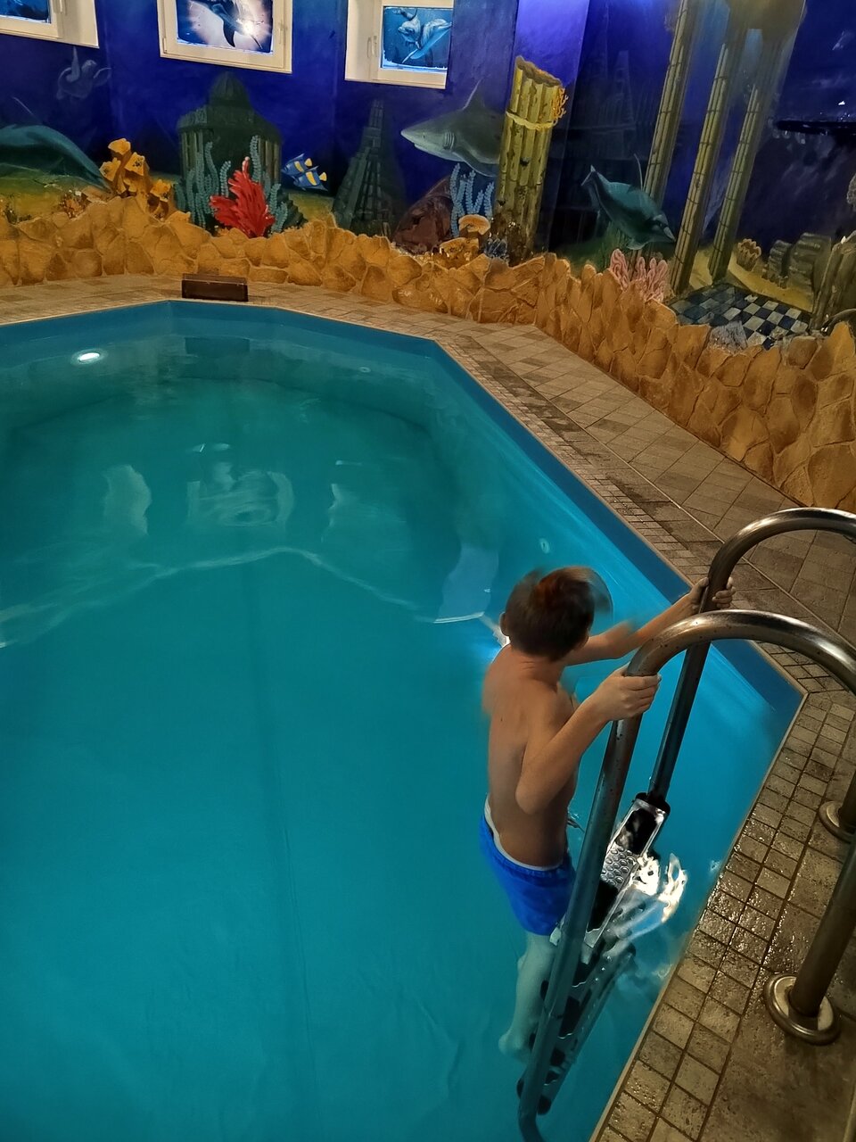 - Холодная вода в бассейне (~23°C).