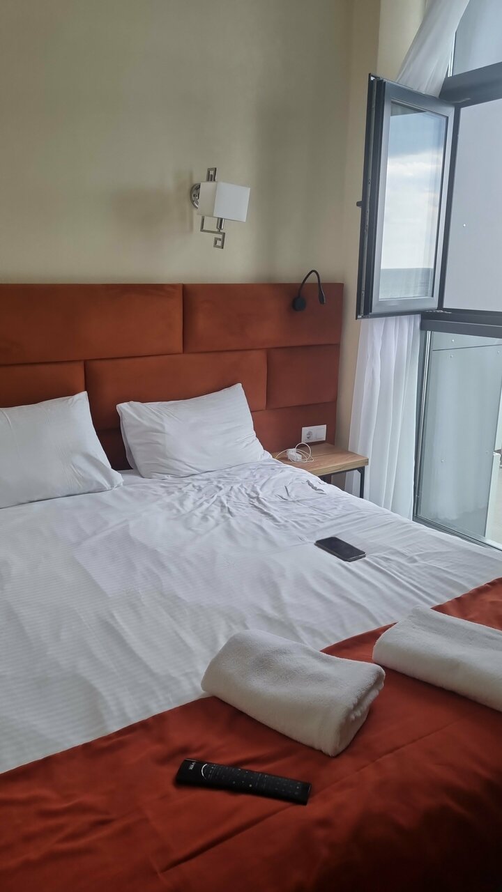 Замечательный отель — идеальное место для отдыха у моря! Мы жили в самом маленьком номере, но места все равно достаточно, есть все необходимое. Идеальная чистота, качественная уборка, очень удобная кровать, блэкаут шторы. А какой вид из окна! Засыпать и просыпаться под шум моря Отдельно надо отметить шумоизоляцию — все номера были заняты, но мы не услышали ни звука, даже от семьи с маленьким ребенком. Хозяйка Алина всегда на связи, помогает по всем вопросам — в нашем случае даже привезла пледы, чтобы мы могли сходить на пикник. Для гостей есть зонтики, которые можно взять на случай дождя. Вокруг отеля масса замечательных ресторанов, есть магазины продуктов и все достопримечательности города в шаговой доступности.