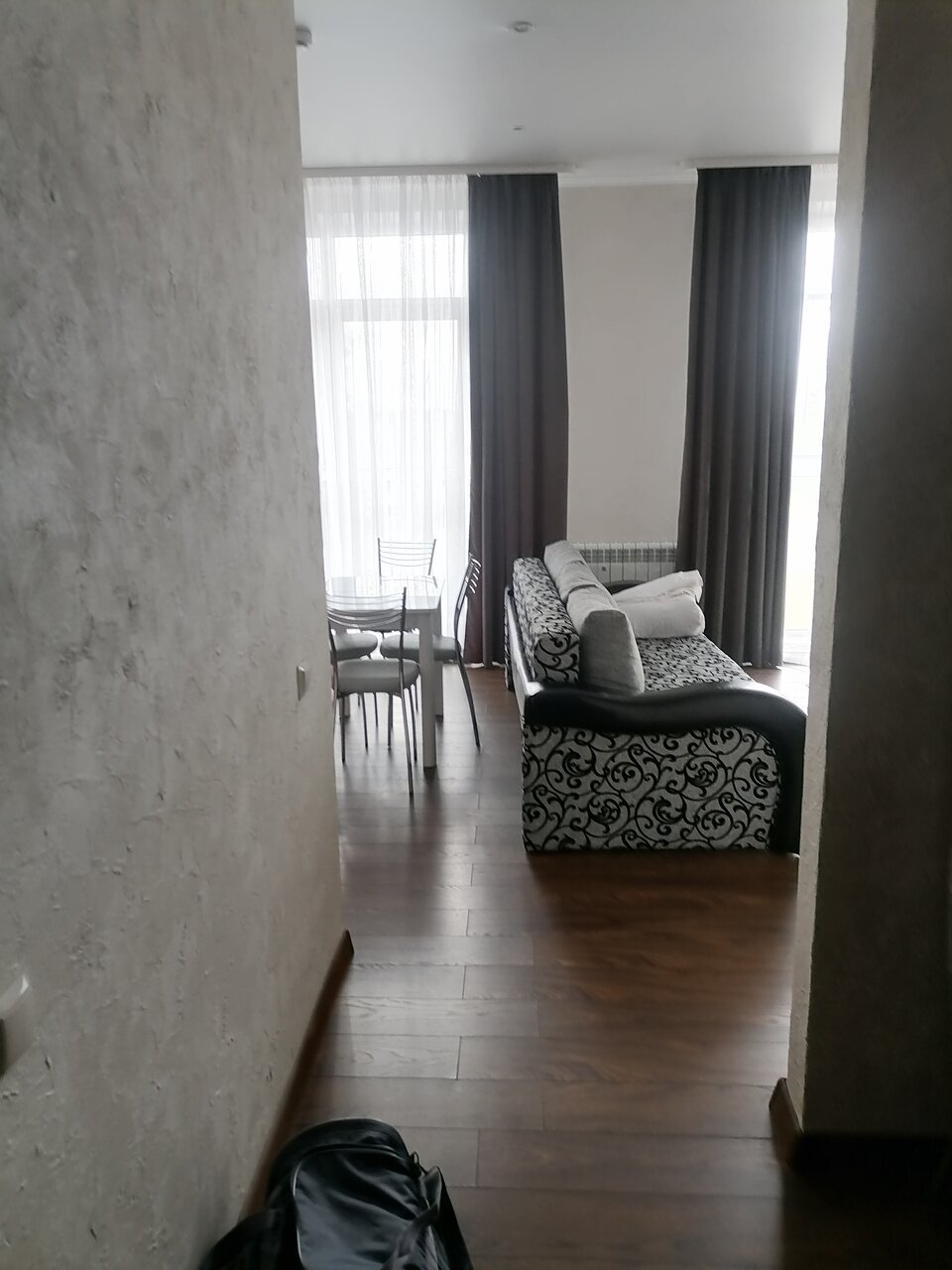 Хорошие апартаменты, море близко. Чисто, все необходимое, кроме халатов есть. Закрытый двор. Вид на соседний дом. Не спросили сколько стоит опоздание при выезде, при выезде 12:10 заплатили 500 рублей, не много , вроде бы , но неожиданно