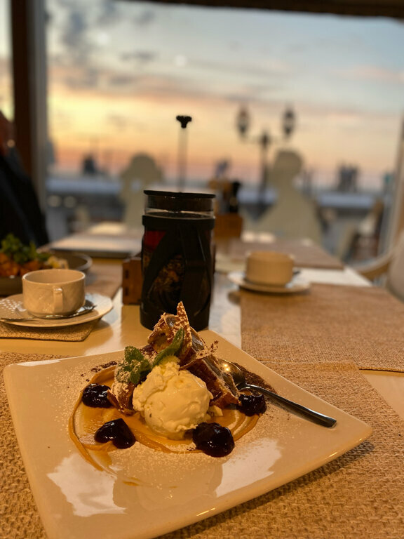 В этом отеле второй раз (первый в 2018 году) — снова доволен. Прекрасный чистый номер, вежливый учтивый персонал. Большим преимуществом считаю — свой ресторан, с утренним шведским столом. Обеды и ужины — порции огромные (аккуратно!). Все, что заказывали очень вкусно. Рыбные блюда — свежайшая рыба. Официанты — на высоте! Кроме ресторана, есть бассейн и тренажёрный зал, если вам не хватило прогулок по набережной и старому городу , отель на первой линии. Остался доволен. Буду рекомендовать близким, будет возможность — вернусь ещё. З. Ы: замечательные виды из окна номера (фото ниже)