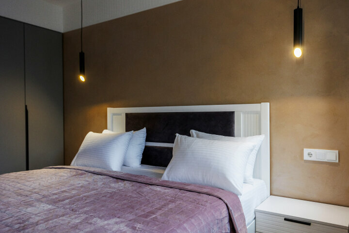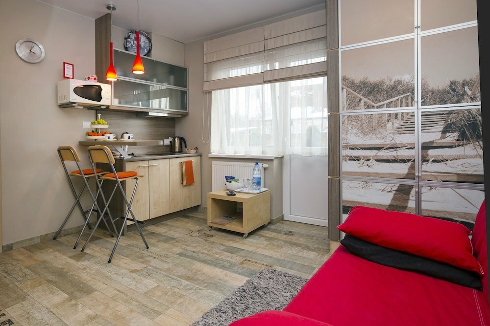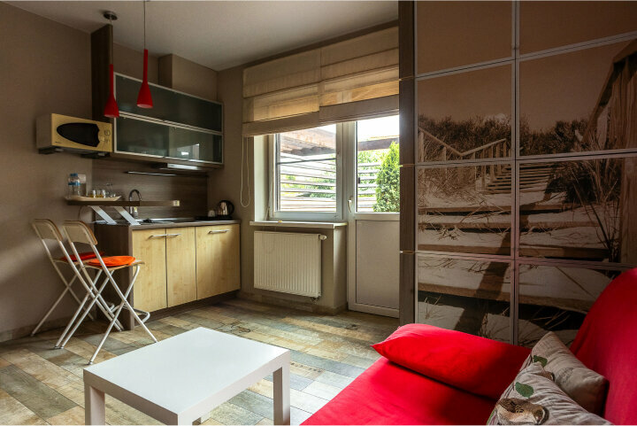 Уютные однокомнатные апартаменты предлагают все необходимое для комфортного проживания. В спальне двуспальная кровать с удобным матрасом, а также просторный шкаф для вещей. Кухонная зона оснащена современной плитой, микроволновкой и холодильником.