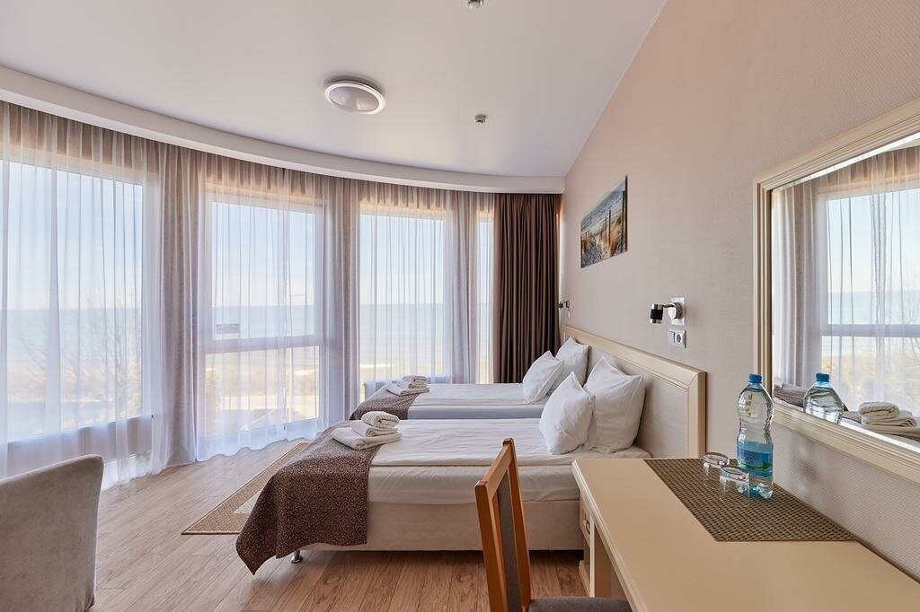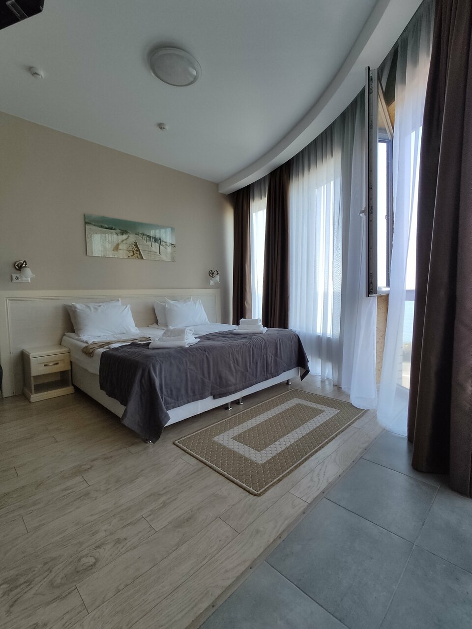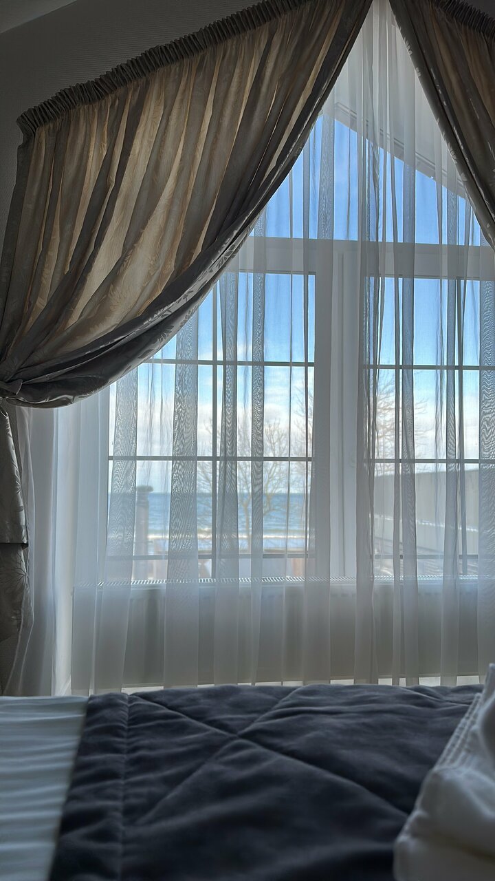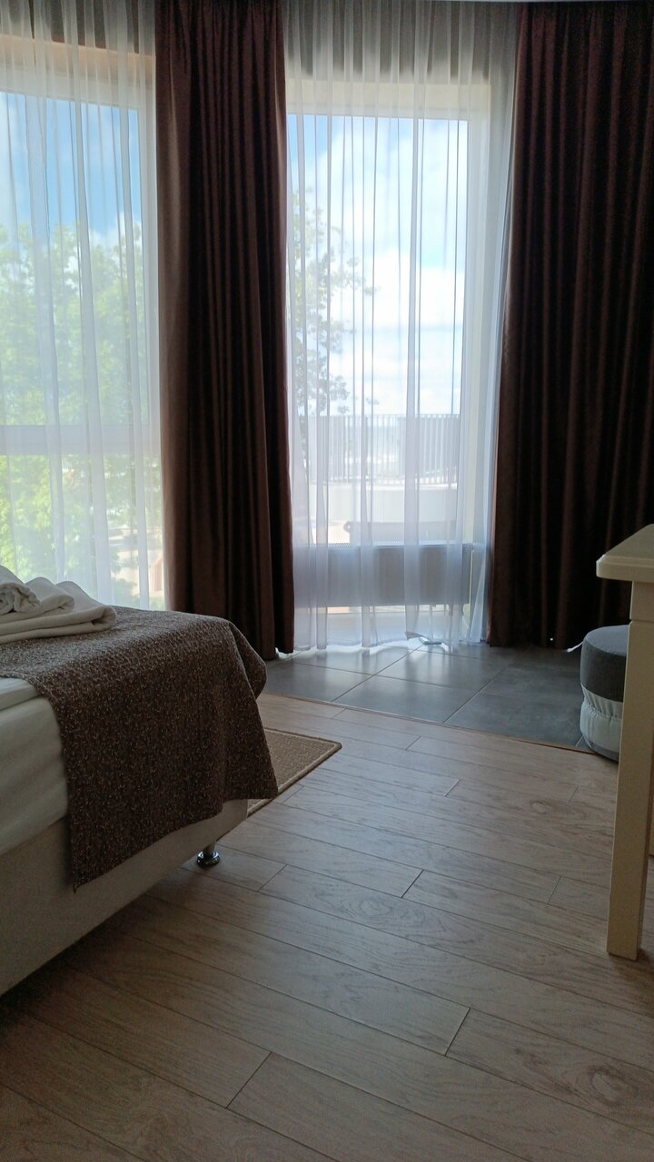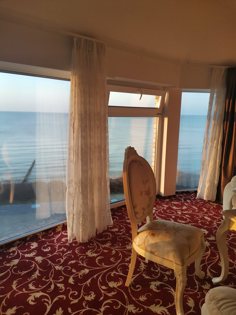 – Сразу расскажу про номера. Номер уютный, красивый и главное.. ЧИСТЫЙ. Каждый день приходит персонал и заменяет полотенца, воду, моет пол, моют зеркала и многое другое. Удобная кровать большие окна в каторые светит яркое зеленоградское солнышко.. Разве не потрясающи? Места много.. Тёплые полы в ванной комнате, фен, освежитель воздуха. Какие минусы? Минус вижу один. У кровати нет розеток.. Они есть в самой спальной комнате(и в других) но не около кровати и это грустно. Но гаджеты же не главное на море?) – Персонал хороший, улыбчивый, приятный и понимающий.. Особое уважение Игорю и Инне) – Отель включает в себя завтрак. Завтрак очень вкусный и сразу при отсутствии какой-то продукции её по возможности пополняют (советую приходить пораньше, а то всё вкусное съедят;)). Кресла удобные, чистые и открывают вид на красивое море… Ммм.. Я в восторге) Приезжала уже 2 раз… И не раз приеду сюда Приятного отдыха) .