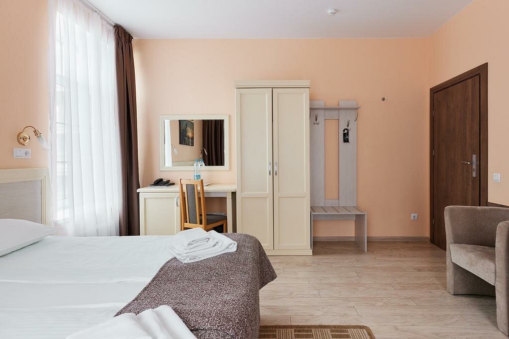 Были в гостях в мае. Очень хорошее обслуживание. Спокойная гостиница. Конечно же, есть маненькие минусы Это полотенцесушитель, на который убираются носки. Полотенце, нет. Отсутствие кондиционера. Хотелось бы чайник в номер или, хотя бы, кулер на этаже. Не очень удобно за водой бегать в ресторан. Да и чайничка мне на чуть-чуть) А постоянно бегать за кипятком не очень удобно. Сидеть в ресторане тоже не хочется. А в остальном, очень чудесная гостиница, очень чисто, внимание со стороны персонала. Если хотите быстро выйти и сразу-море, вам сюда. Очень красивый вид из окна. Вывод: приеду обязательно ещё. Спасибо