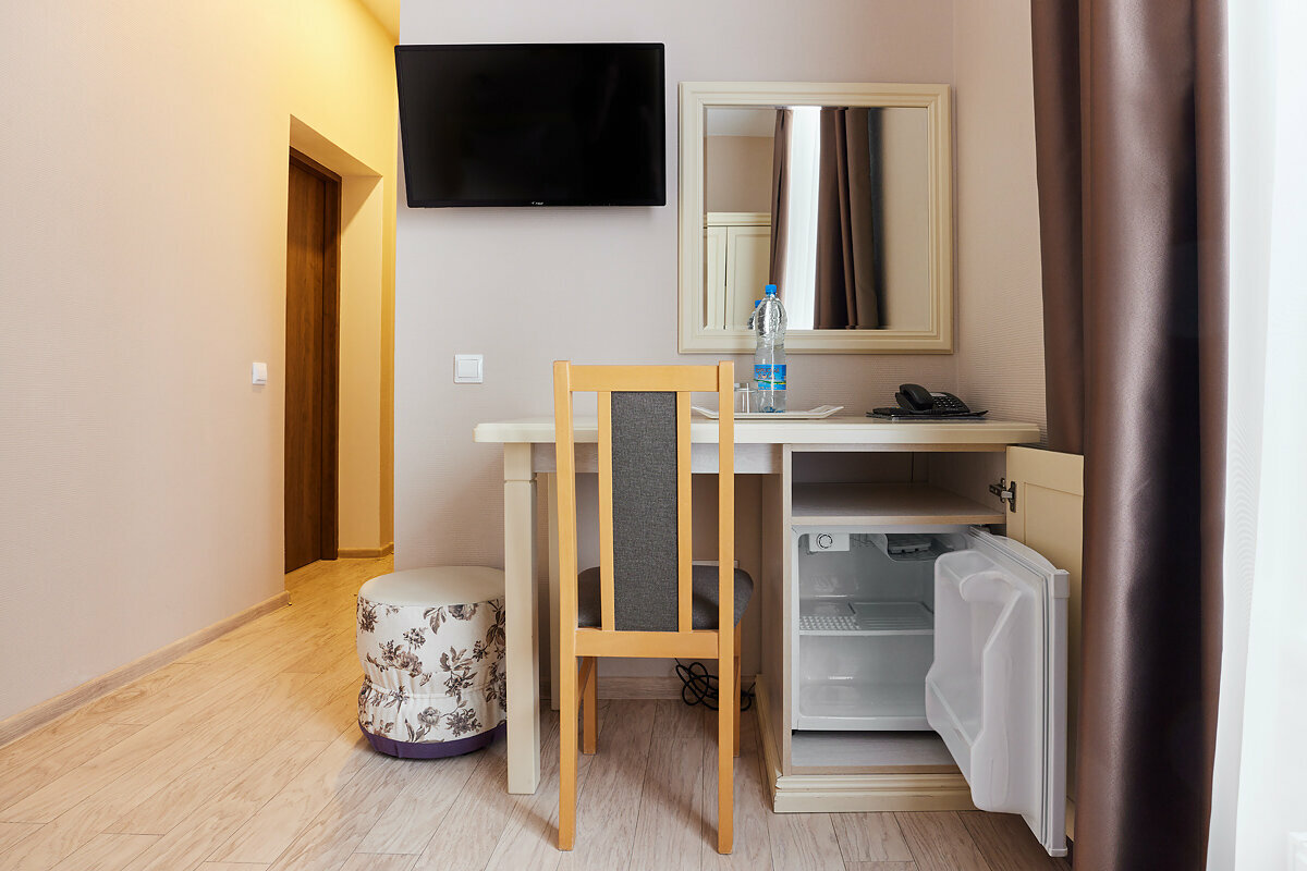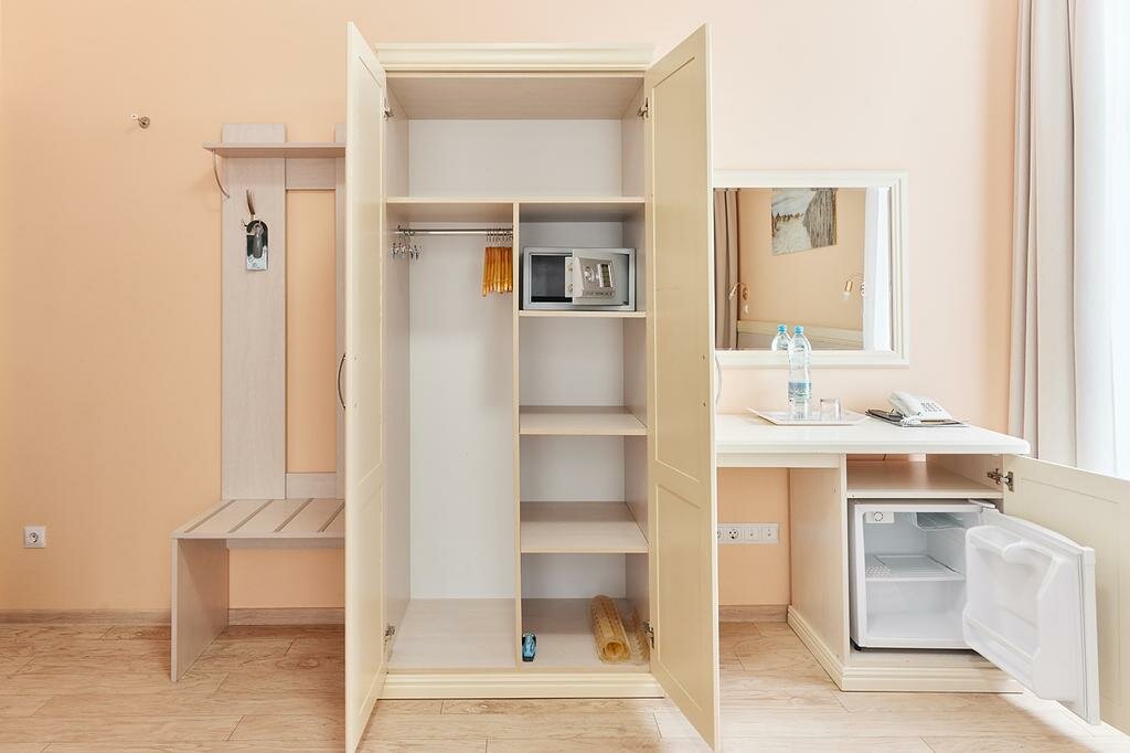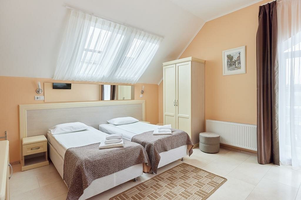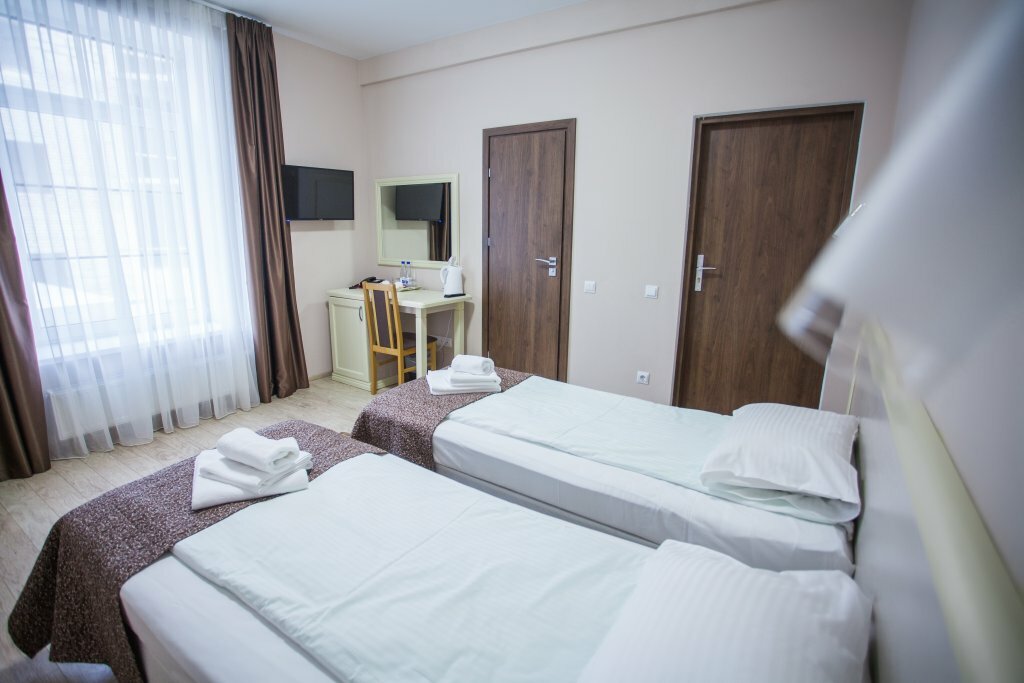 Проживание в 2-3-местном номере со всеми удобствами за 2700 рублей в сутки (одна 2-местная кровать плюс 1-местная кровать при необходимости)