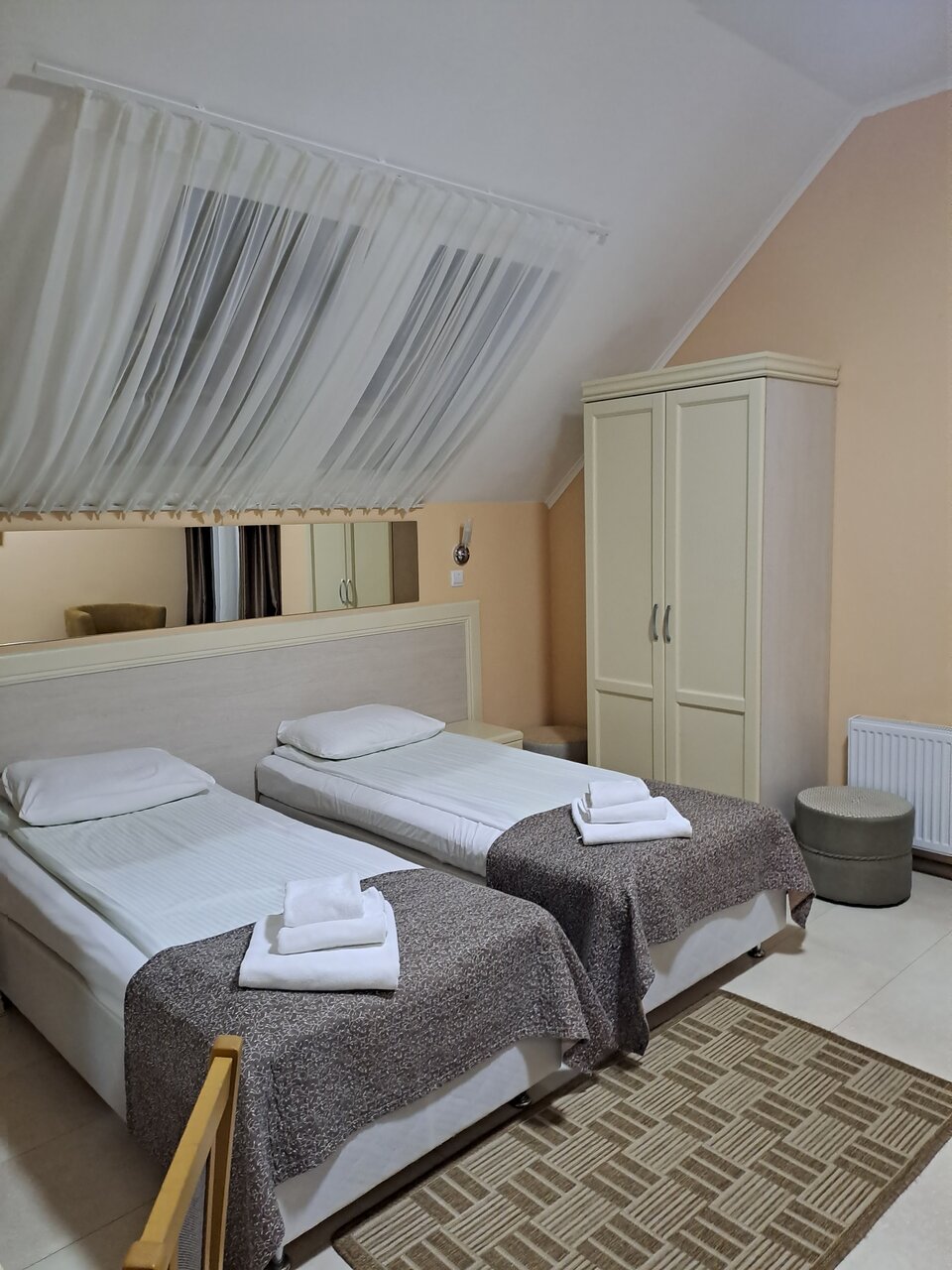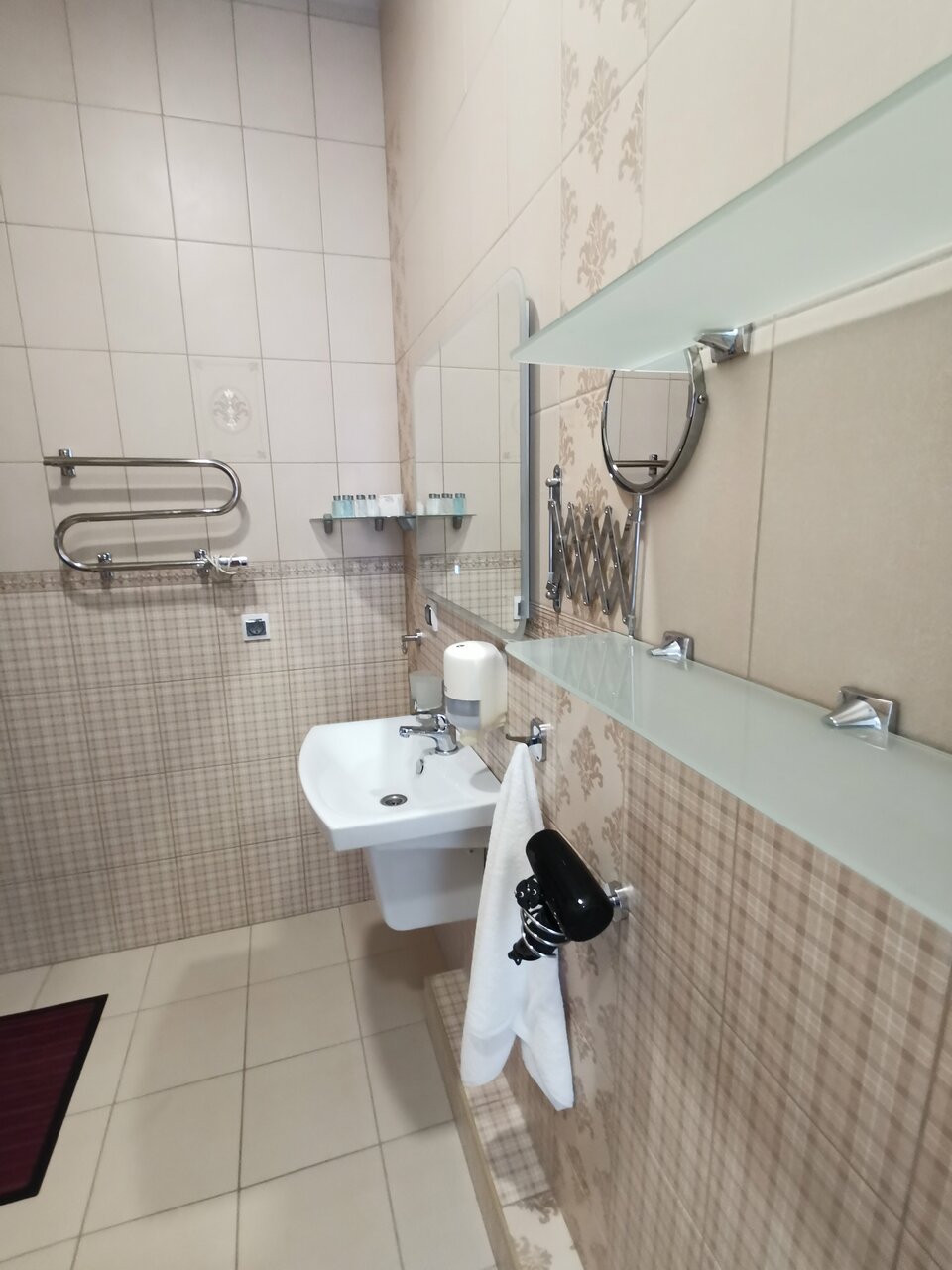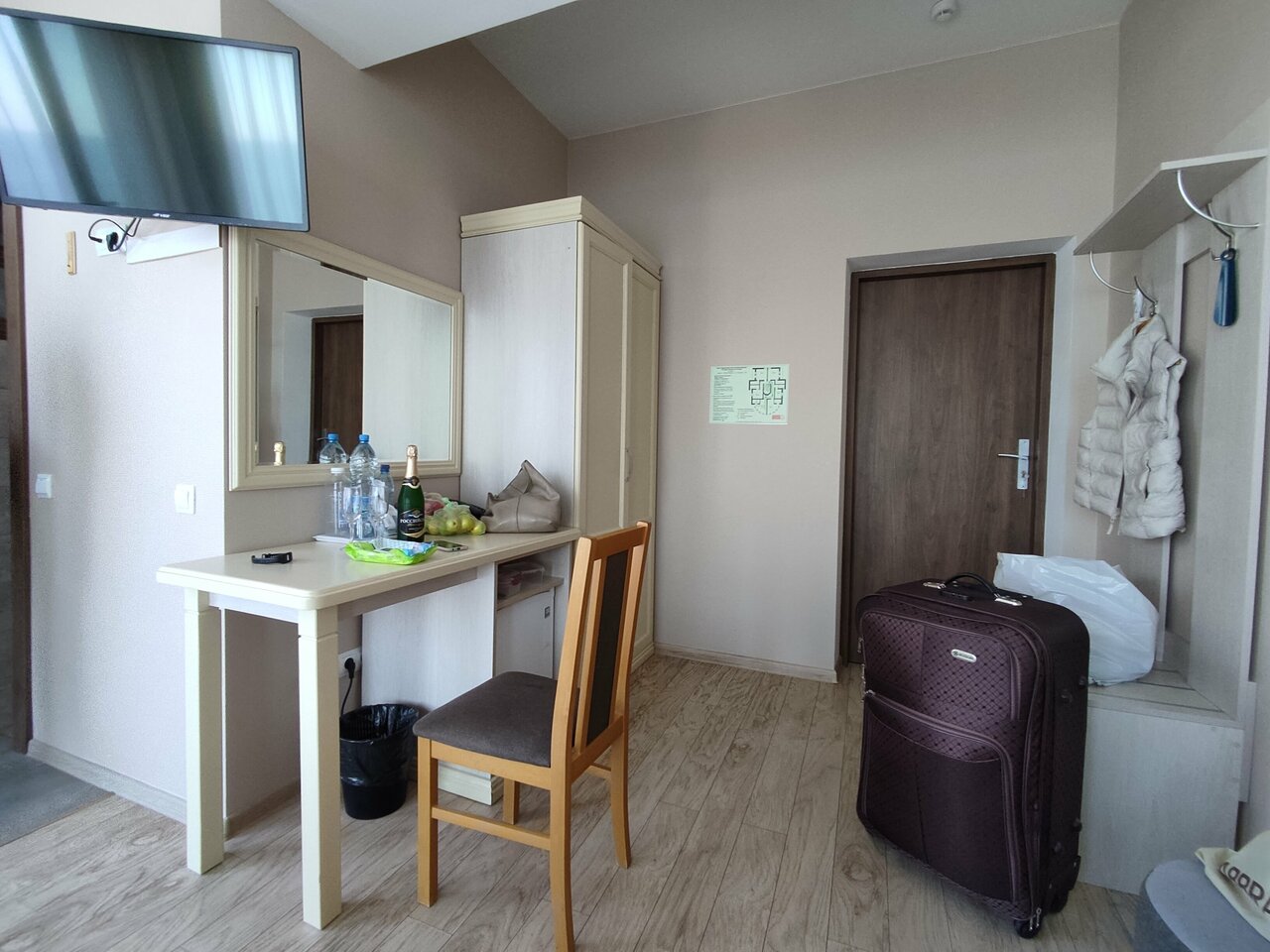 Останавливались в отеле в октябре 2022. Было уже достаточно прохладно. Отопление включают на ночь, особо согреться не получится, батарея работала только на позиции 5. Женщина, сидящая на ресепшен, когда показывала, прошла и даже не разулась в номере, перед этим пройдя по улице в другой корпус. Зубные щётки в номере не предусмотрены, если он не полулюкс или люкс. Но можно купить за 200р — 1 штуку. Тапочек тоже нет, зато есть по 3 полотенца на каждого. Пол ледяной. В душевой на каждого по 1 шампуню и 1 гелю для душа. Ключи просят оставлять на ресепшен уходя из номера, при этом они лежат на стойке в свободном доступе.