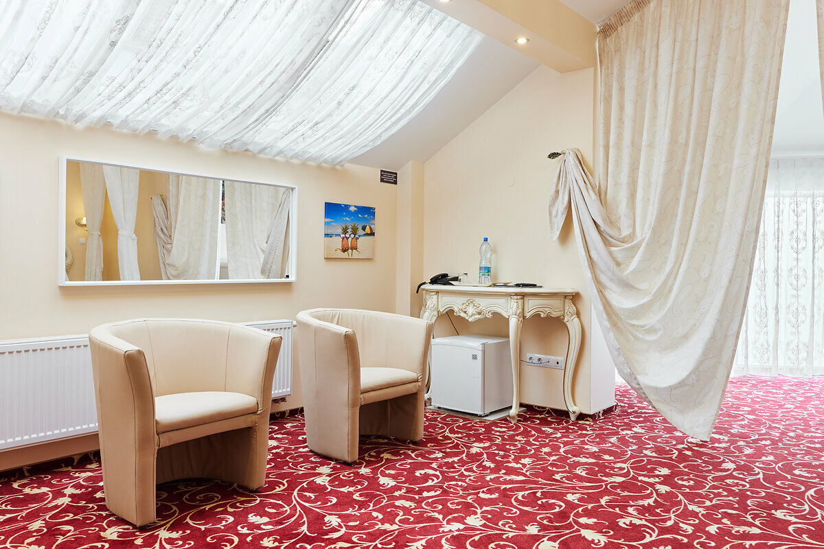 Двухкомнатный люкс - номер повышенной комфортности, площадью около 40м². Номер идеально подходит семьям с детьми!