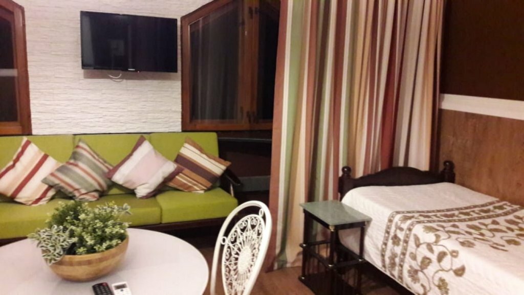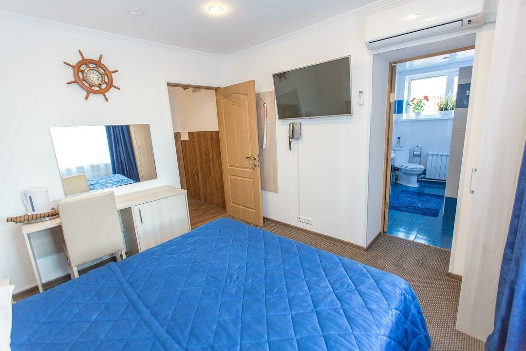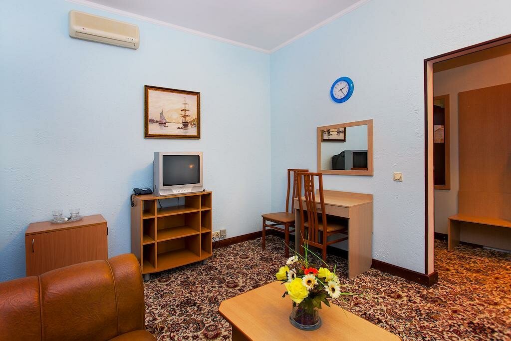 2-х комнатный номер площадью 60 кв м с большим балконом с видом на кипарисовую аллею. В каждом номере кондиционер и телевизор. Две двуспальные кровати + раскладной диван и дополнительное спальное место